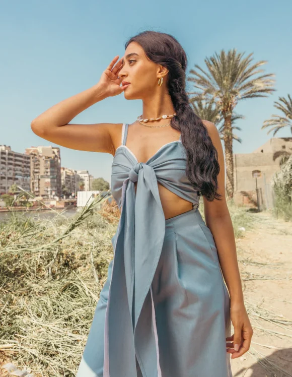 The Hapi Jumpsuit comes in two variations baby blue and a light Eau Du Nil colour. The Hapi Jumpsuit is a 2.0 version of our Thoth Jumpsuit that first launched in QŪT (Capsule VII). This time we bring it to you in a multi-wear detachable option for increased wearability and
