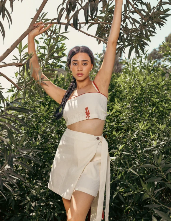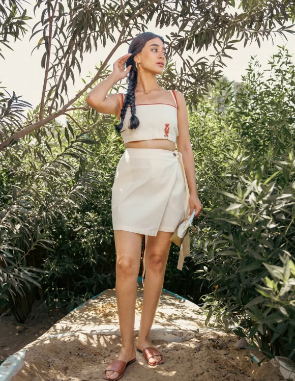 The Embroidered Linen Skirt is an A-line silhouette crafted from 100% linen, featuring soft chiffon inserts at the hem for added flare and movement. Adorned with delicate embroidery inspired by Siwan culture in Egypt, this piece blends tradition with modern elegance.