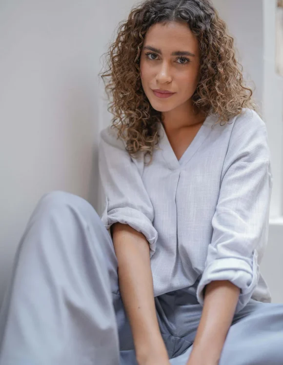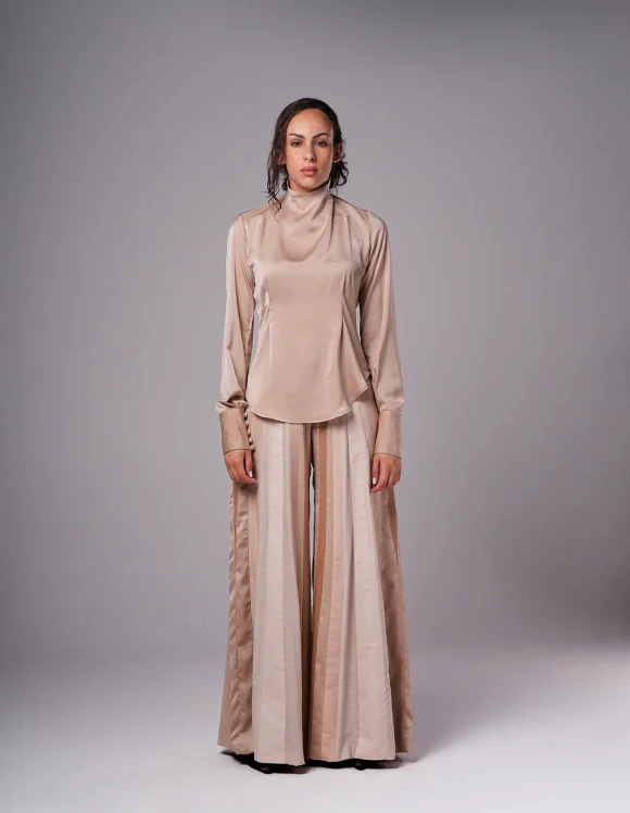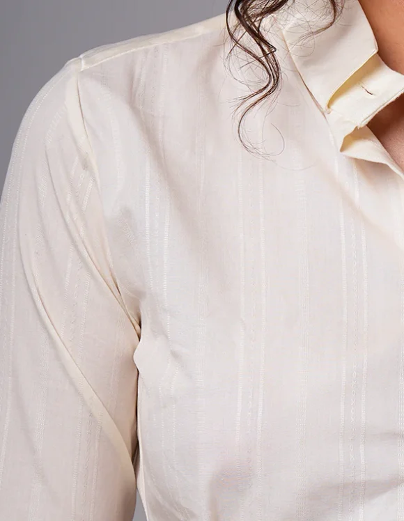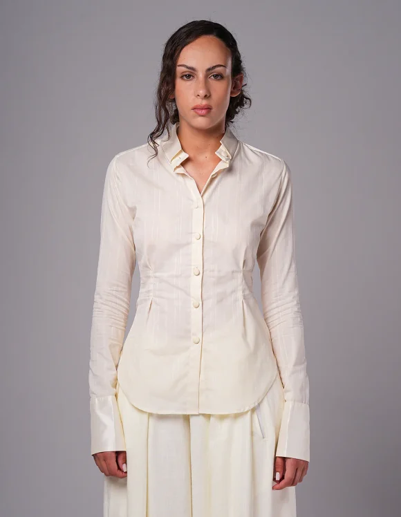 The Beige and White Shirt is our refined take on a classic linen shirt, designed with elegant details that flatter the feminine form. Made from a mix of off-white linen, beige linen, off-white taffeta, and pinstripe linen, it features uniquely crafted buttons in a variety of fabrics. The sides are