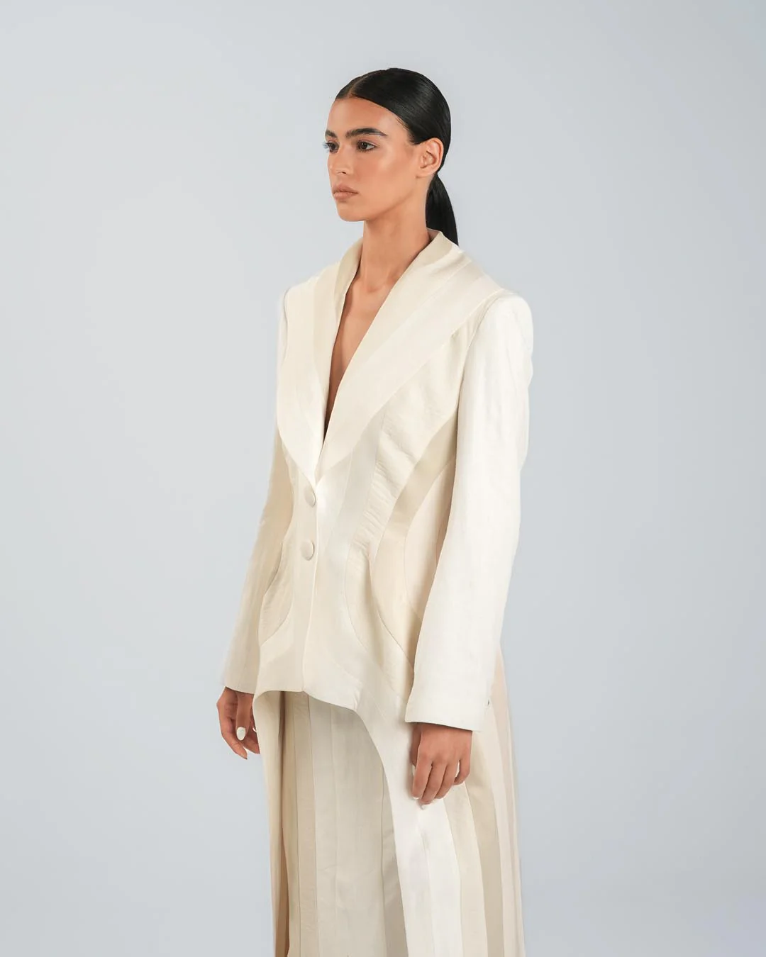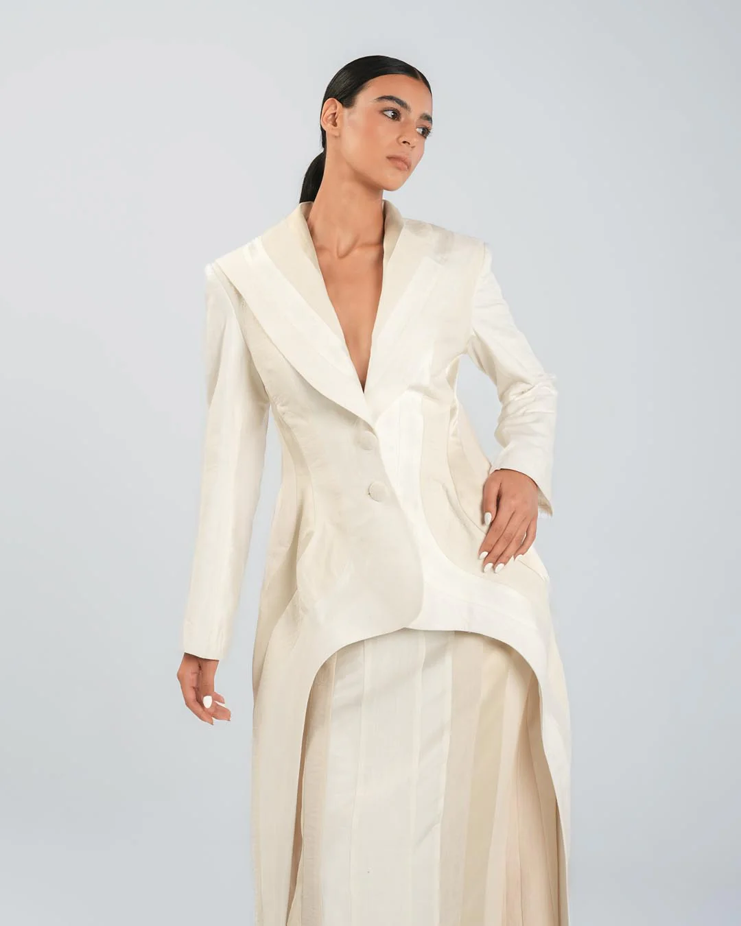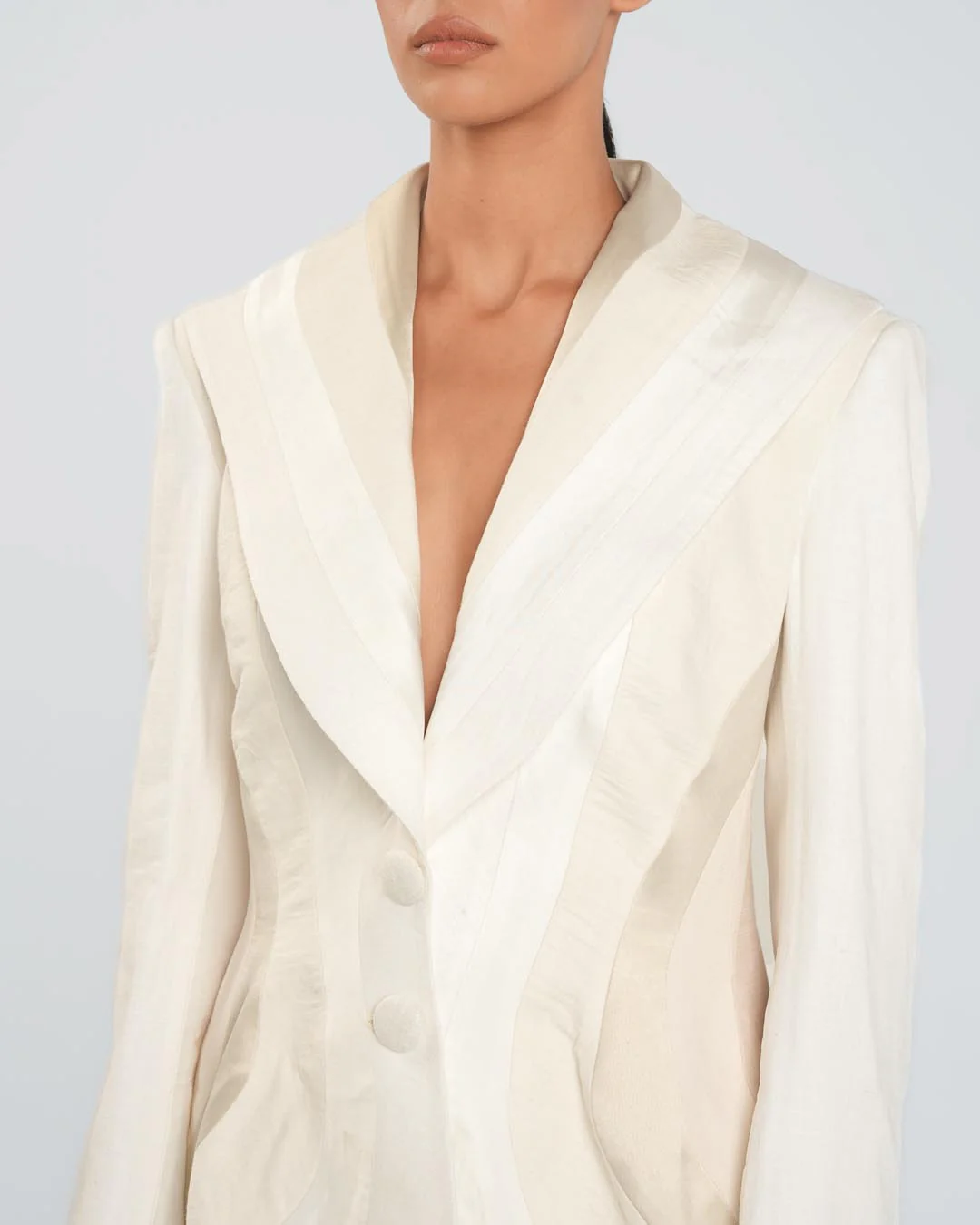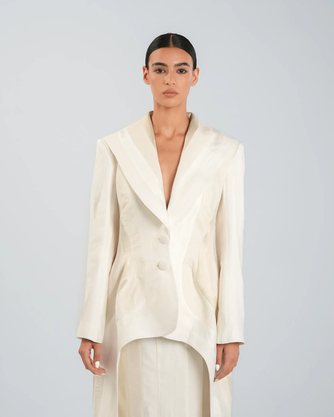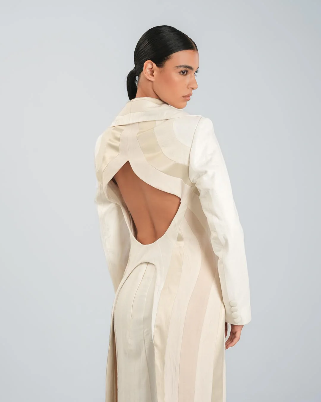 This untraditional Panelled Beige Blazer is sculpted from six different fabrics, ranging from linen to satin, creating rich texture and dimension. Featuring long sides, a cut-out back, and strategically placed panels that highlight the feminine silhouette, it redefines classic tailoring with an avant-garde twist.