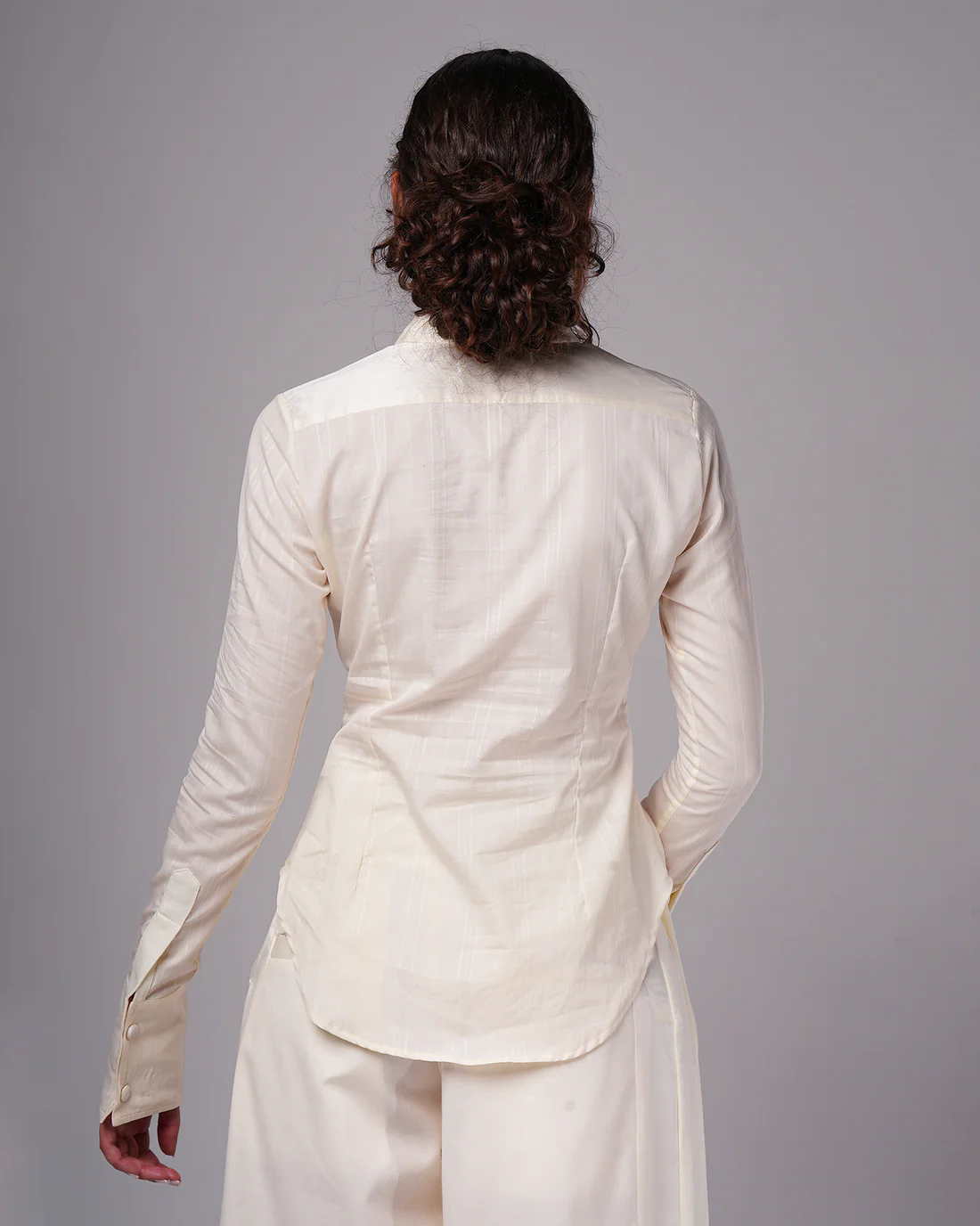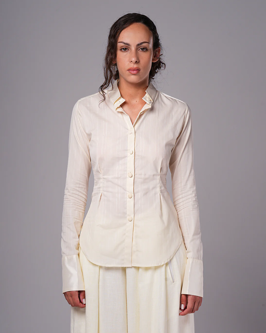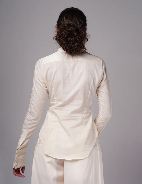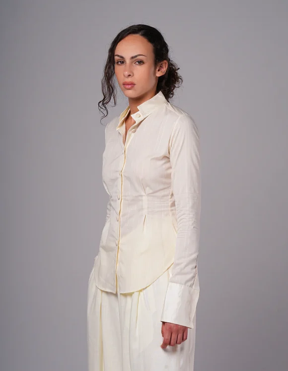 A refined twist on a classic silhouette, this fitted shirt is crafted from crisp poplin and lustrous taffeta. The bold double-layered collar makes a striking statement, while the cinched waist with closed pleats enhances the figure. Finished with dramatic taffeta cuffs for an elevated, fashion-forward touch.