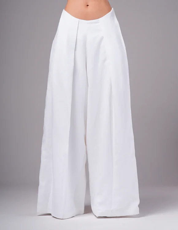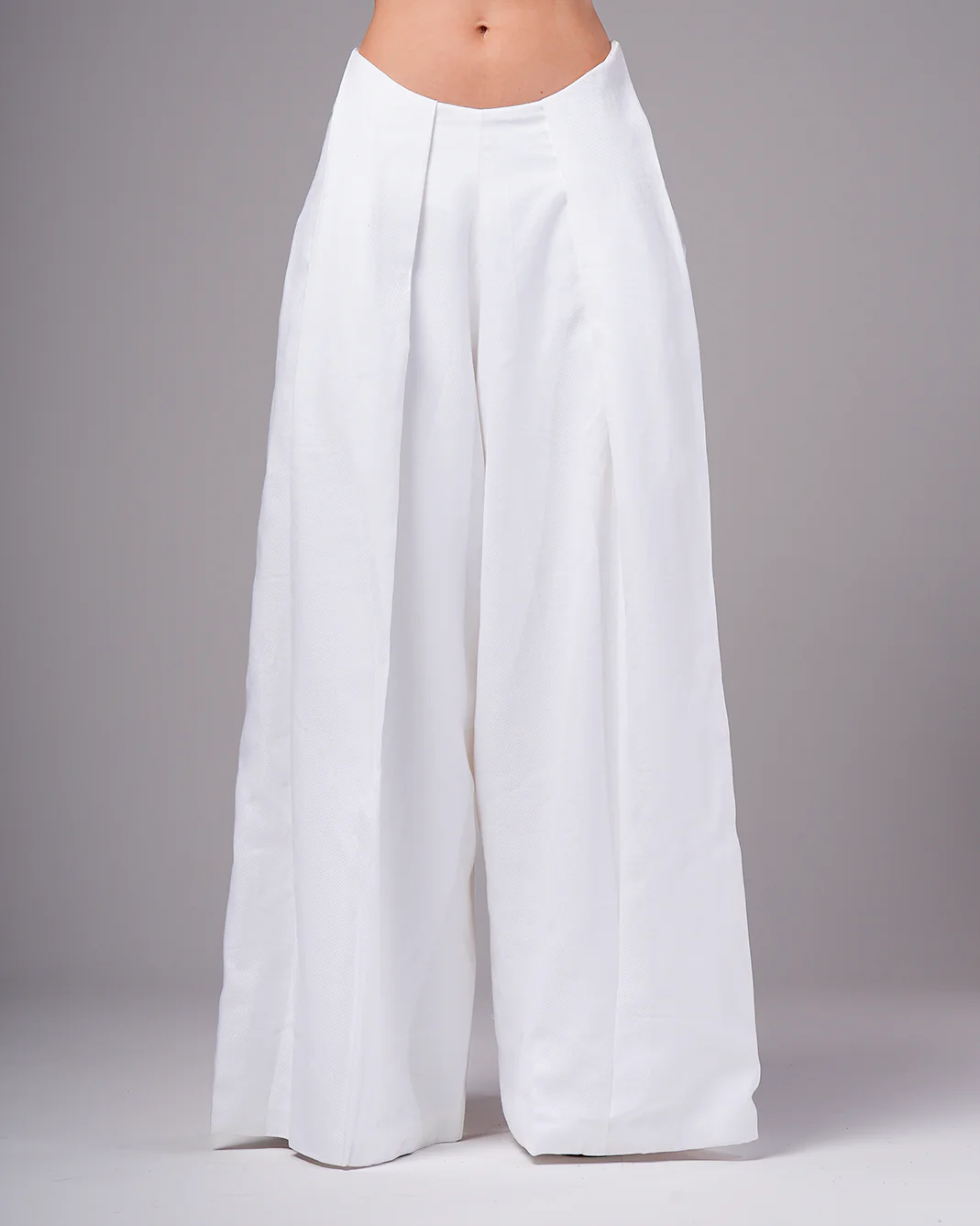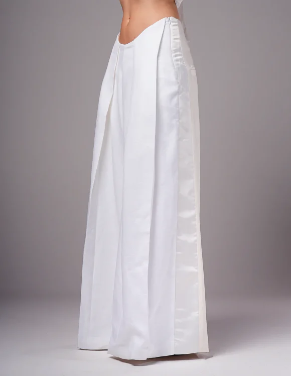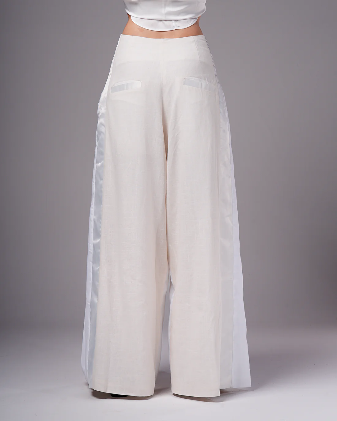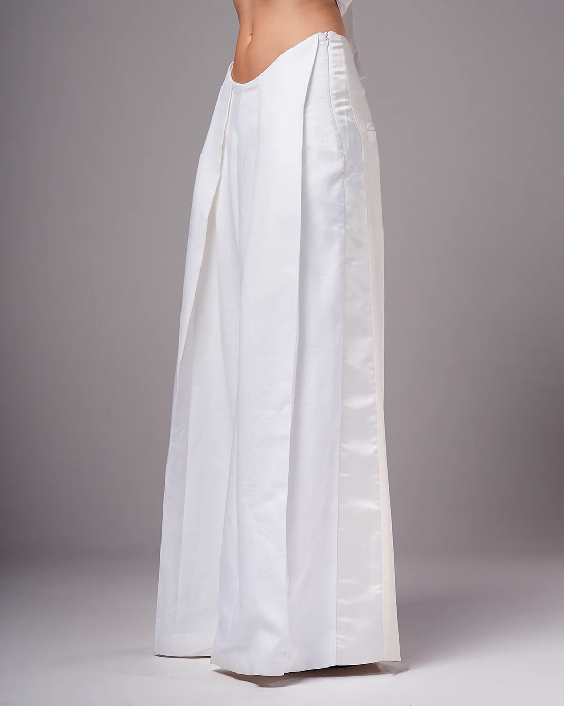 In a refined off-white tone, these tuxedo-inspired pleated pants are tailored from a luxurious blend of satin, linen, and cotton blend. The sharp pleats and flattering V-shaped waistline bring a modern edge to classic tailoring, while four functional pockets ensure practicality without compromising style. Fully lined in silk for a smooth, elevated finish against the skin.