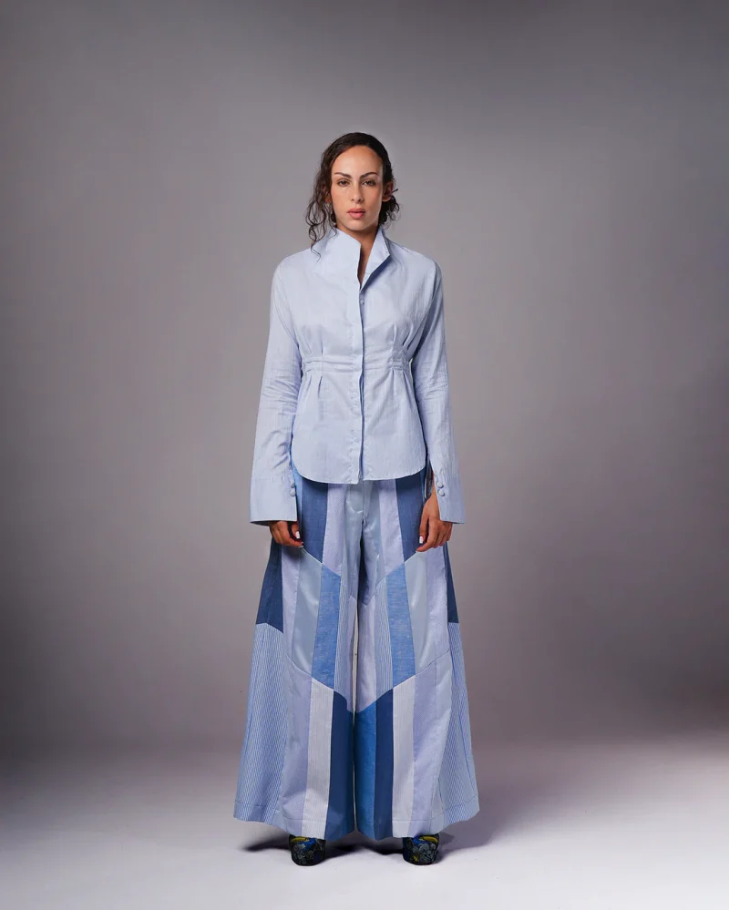A modern twist on a classic, this tailored blue shirt is crafted from crisp poplin cotton. Designed with a distinctive collar and bold statement cuffs, it offers a refined yet fashion-forward edge. Perfect for pairing with both casual and tailored pieces.