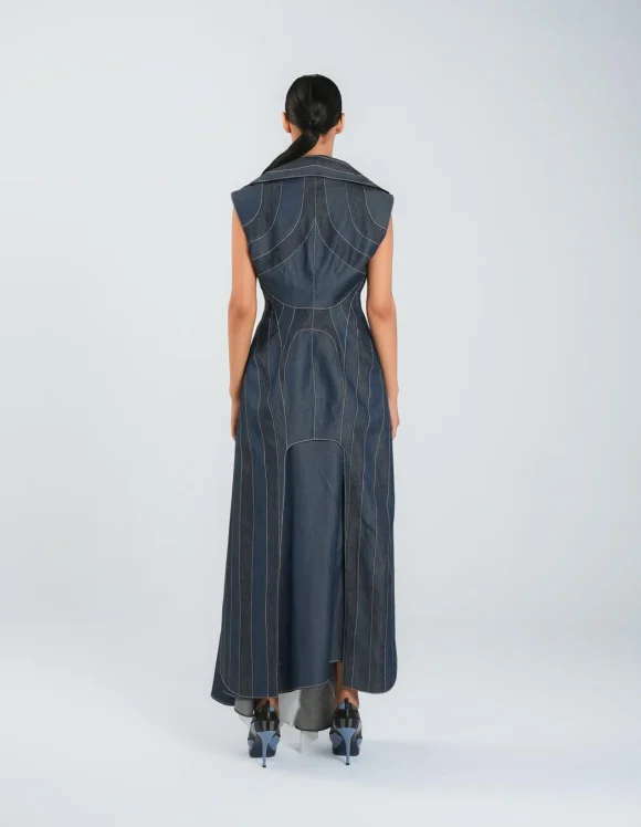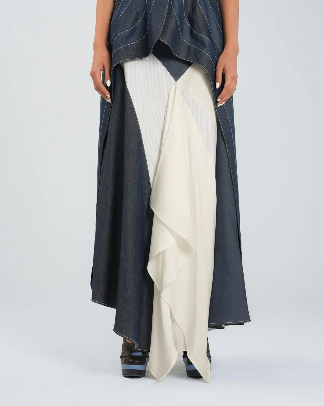 The Draped Denim Skirt is an asymmetrical design crafted from cotton pinstripe, silk, and two types of lightweight summer denim. Expertly folded and draped, it creates a soft, feminine silhouette with an airy, effortless feel.
