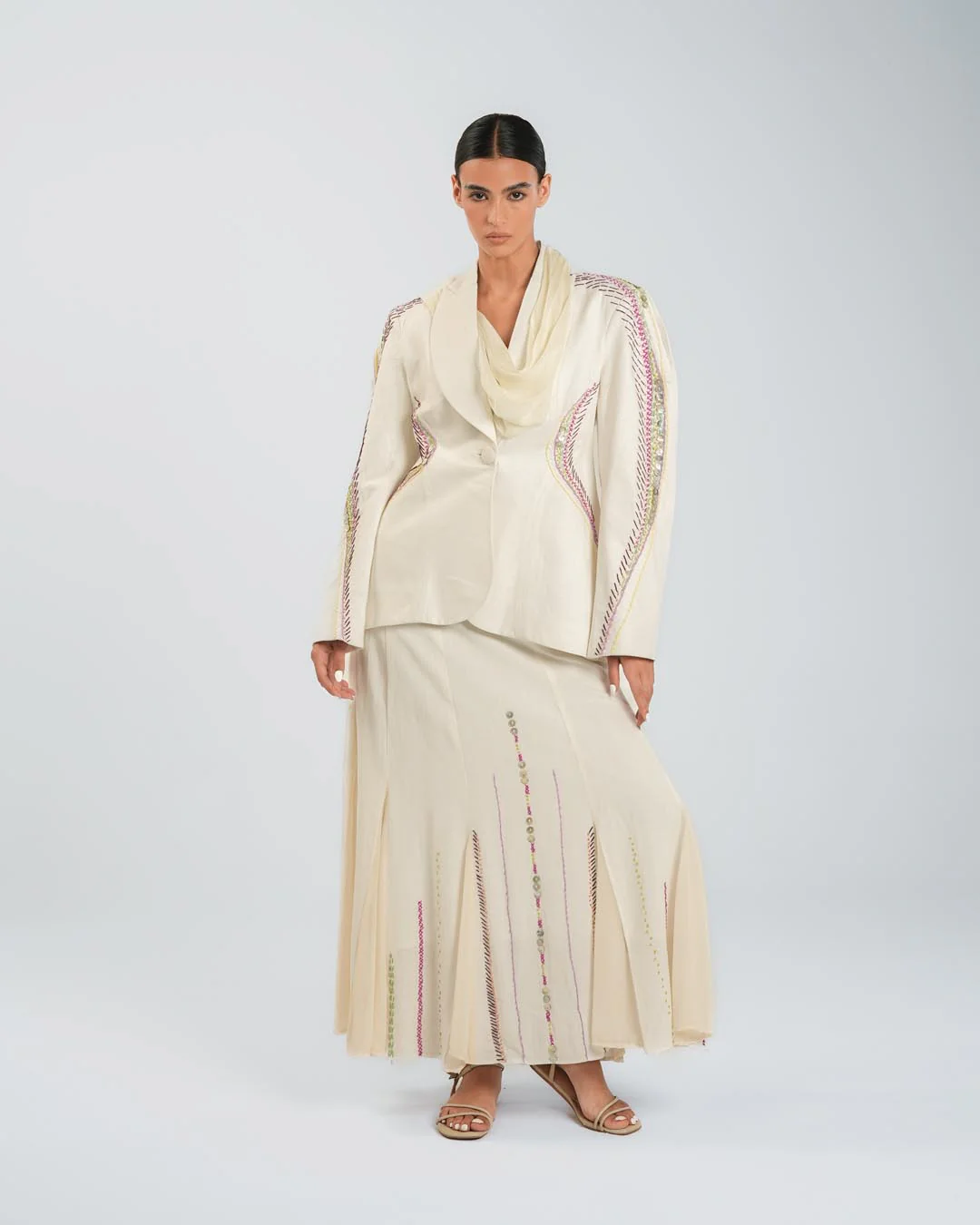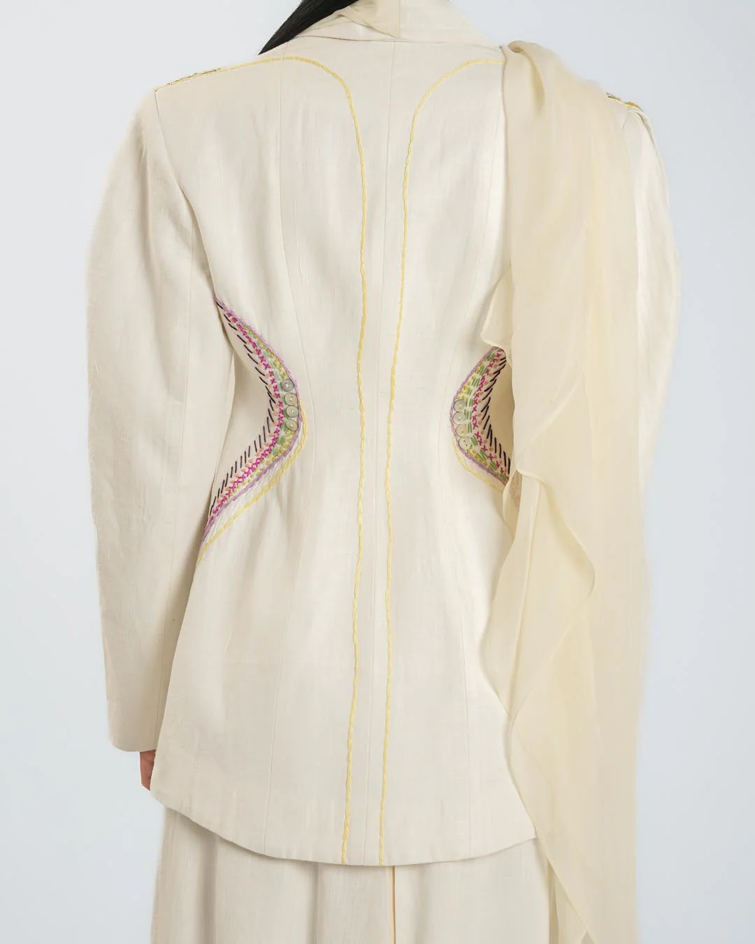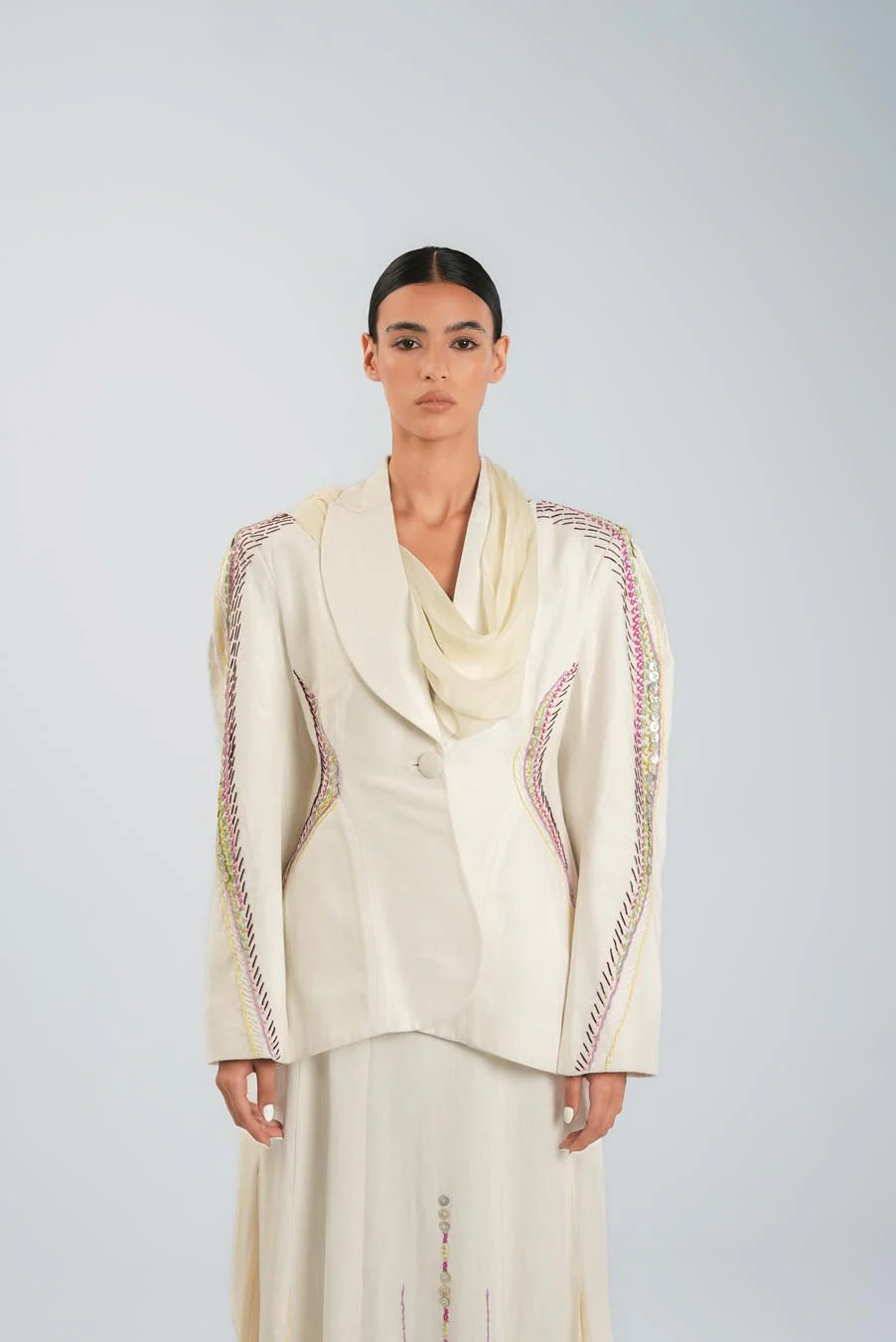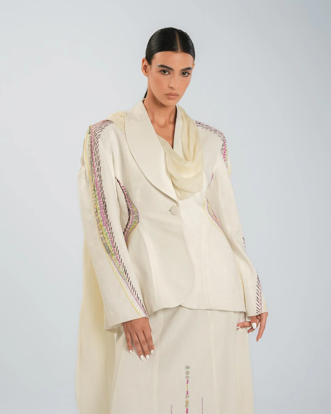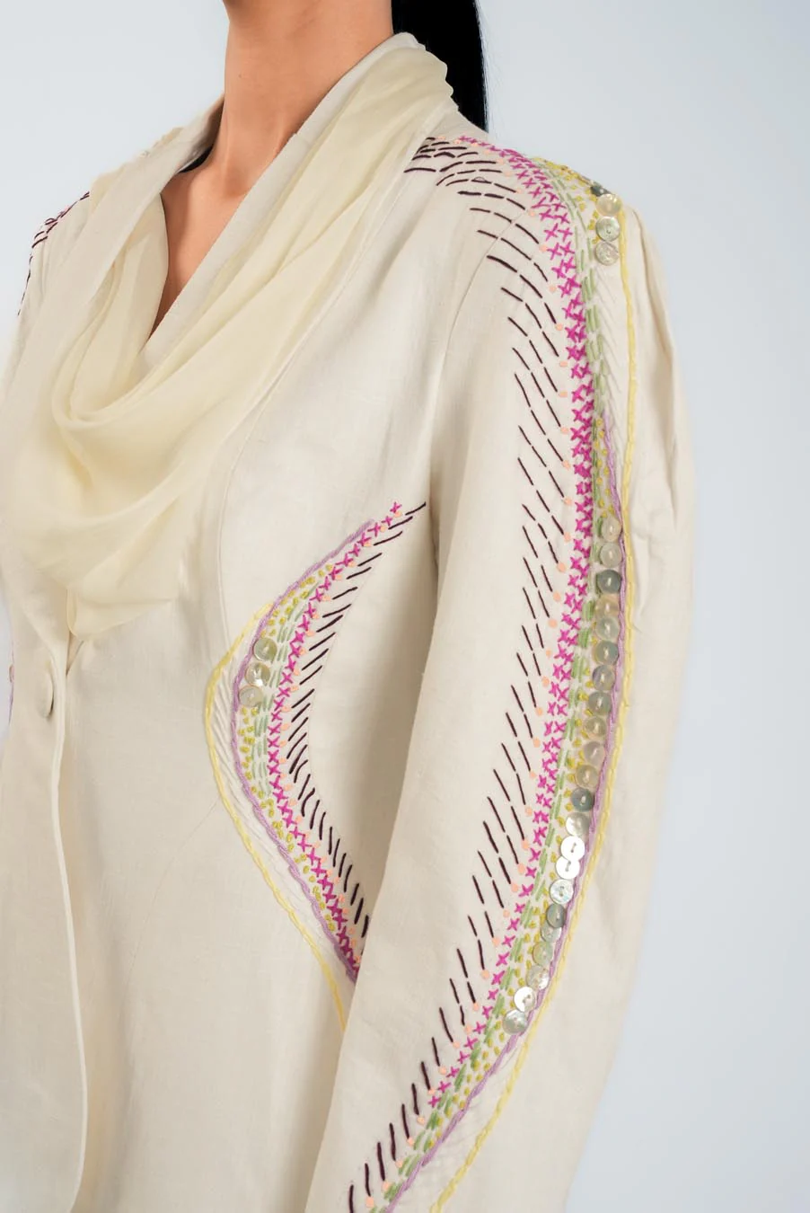 Details: Siwan-inspired embroidery, pleated sleeve, integrated wrap scarf