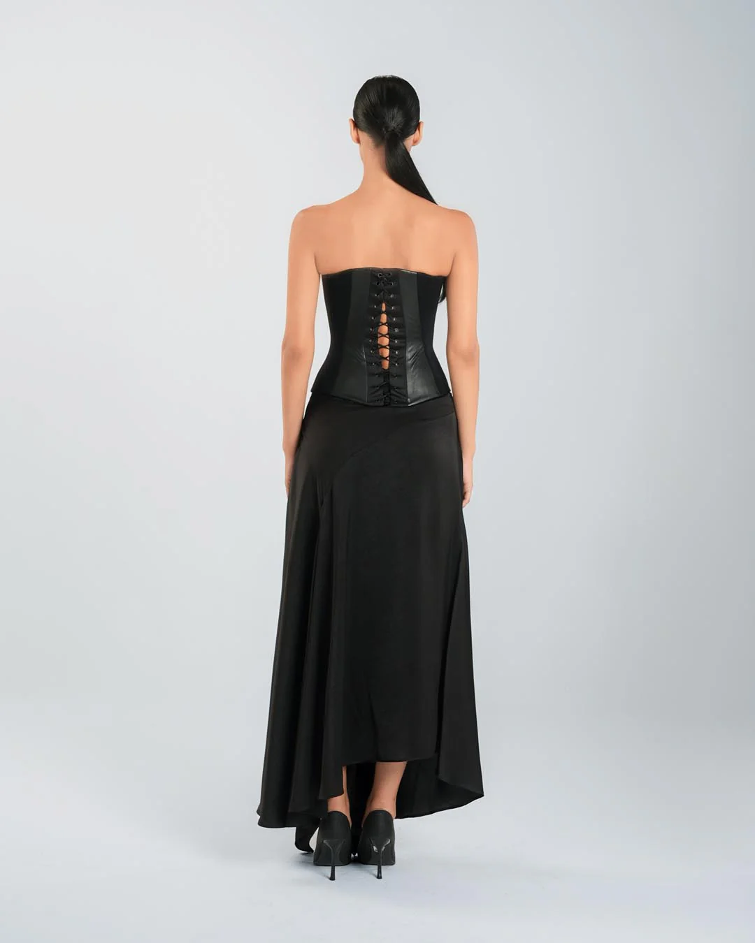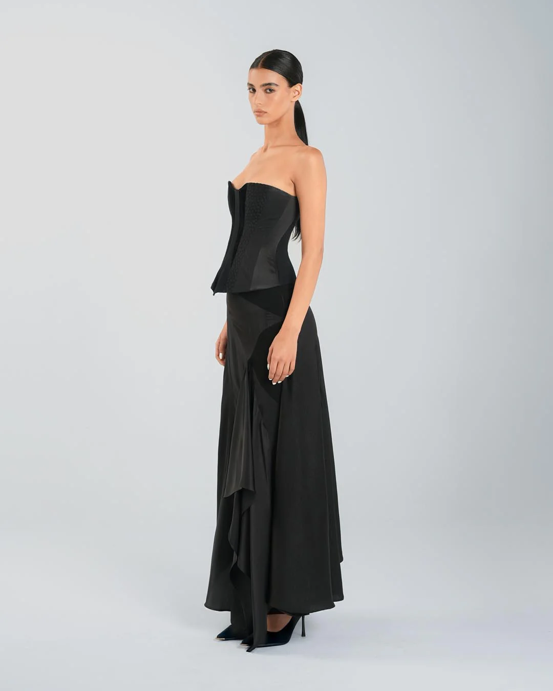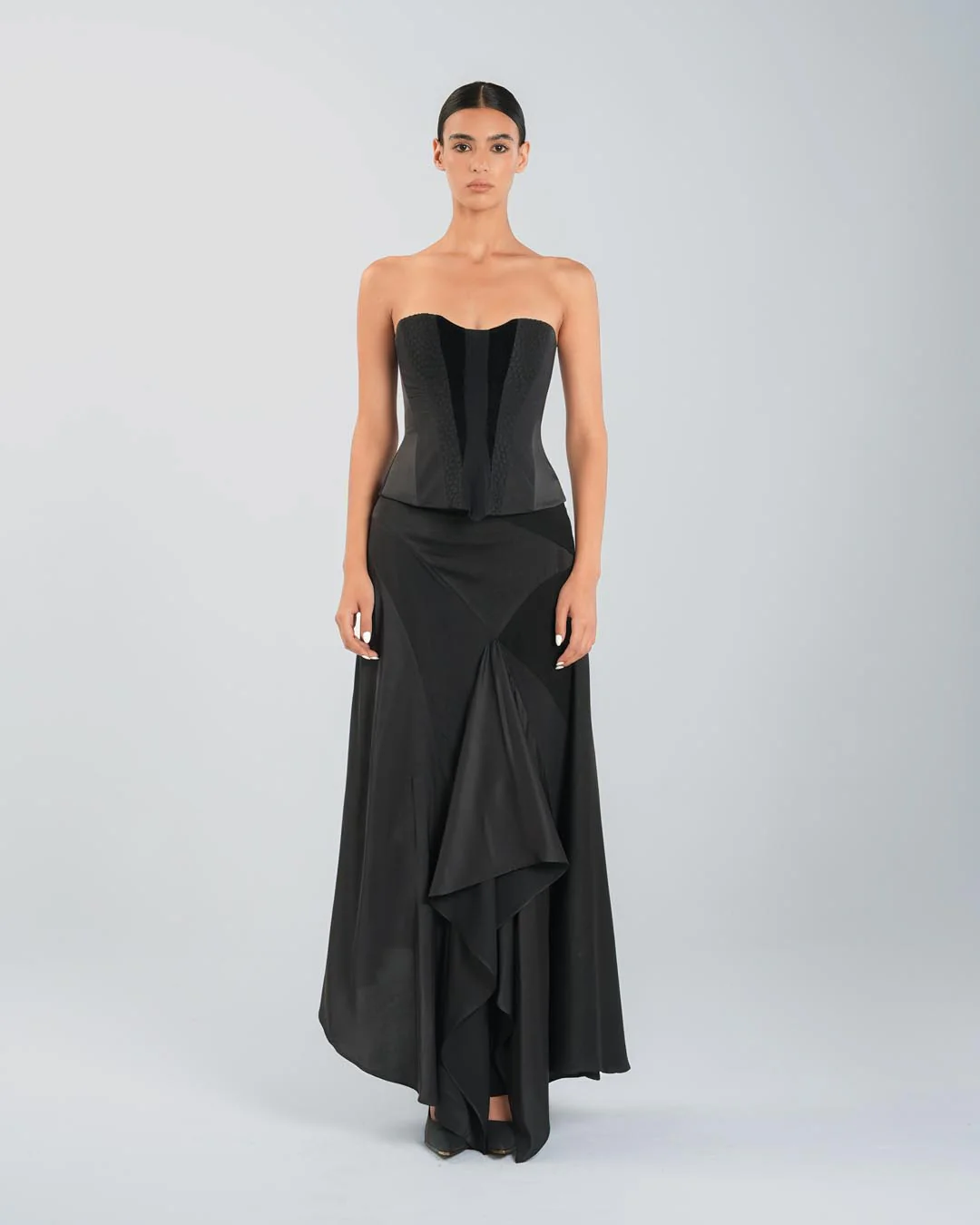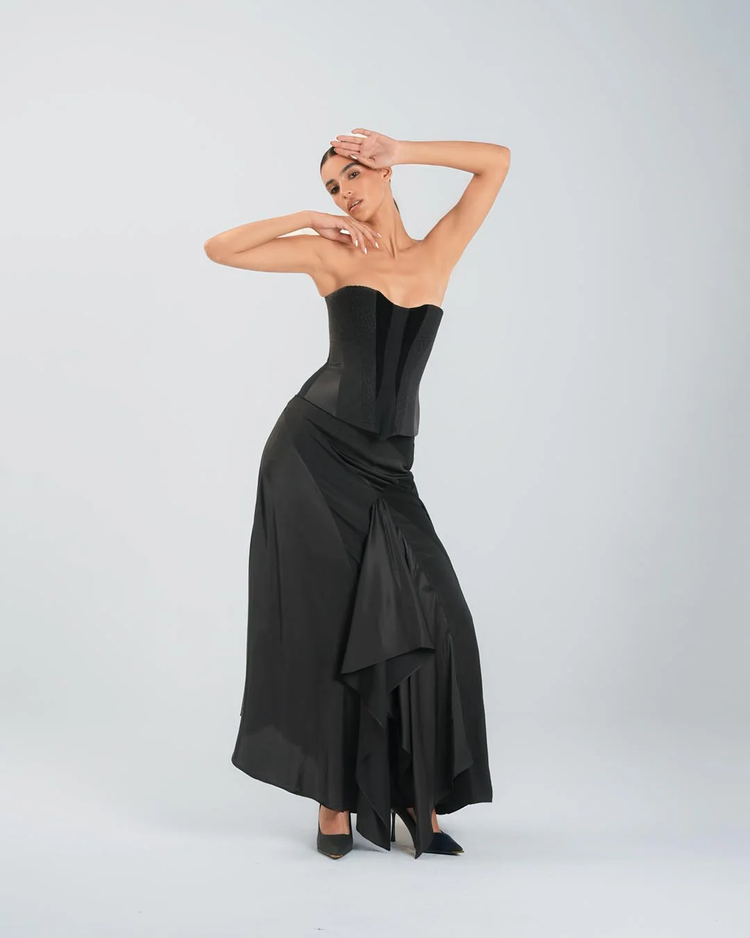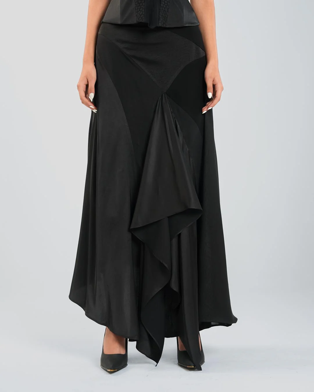 The Draped Silk Skirt is an asymmetrical design crafted from multiple types of lightweight silk. Expertly folded and draped, it creates a soft, feminine silhouette with an airy, effortless feel.
