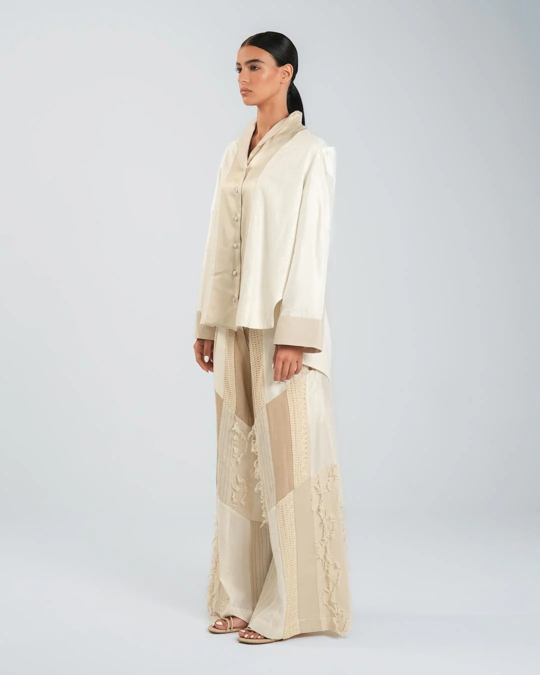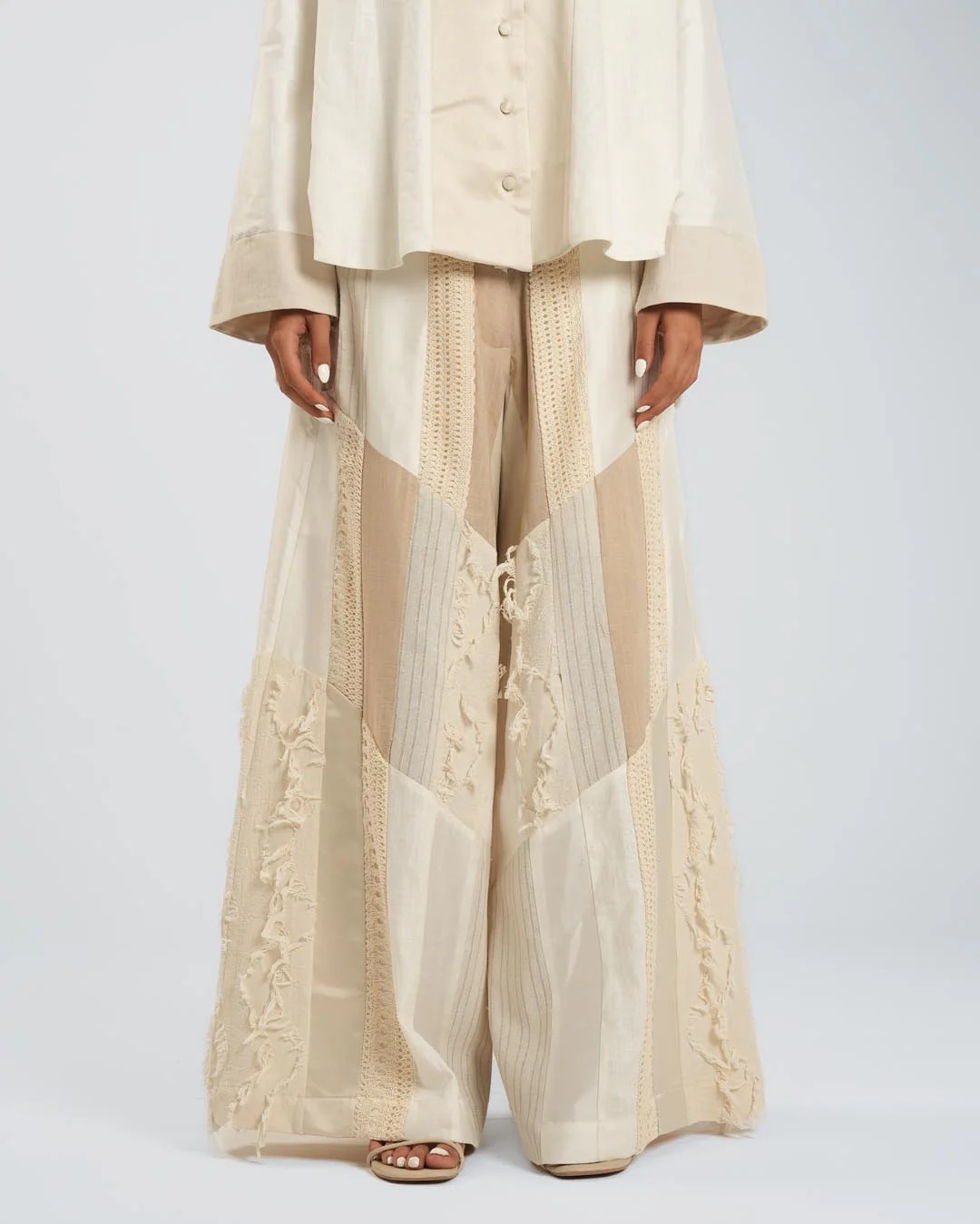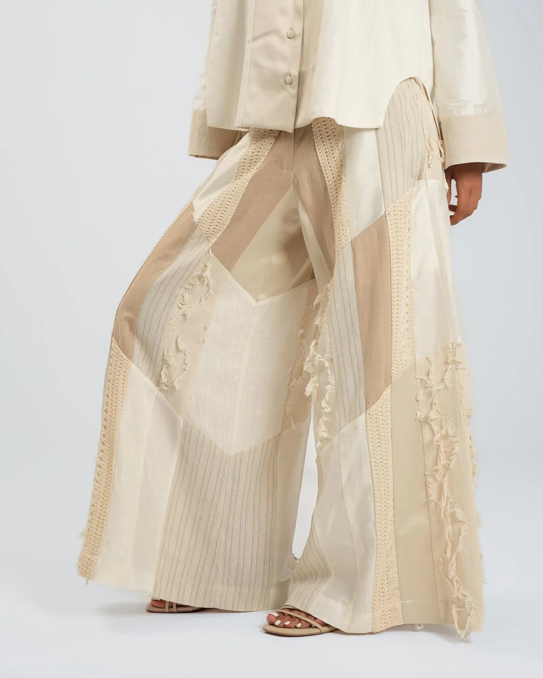 Details: Patchwork of linen and cotton in soft beige and off-white tones