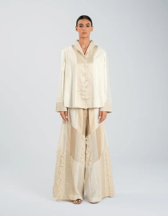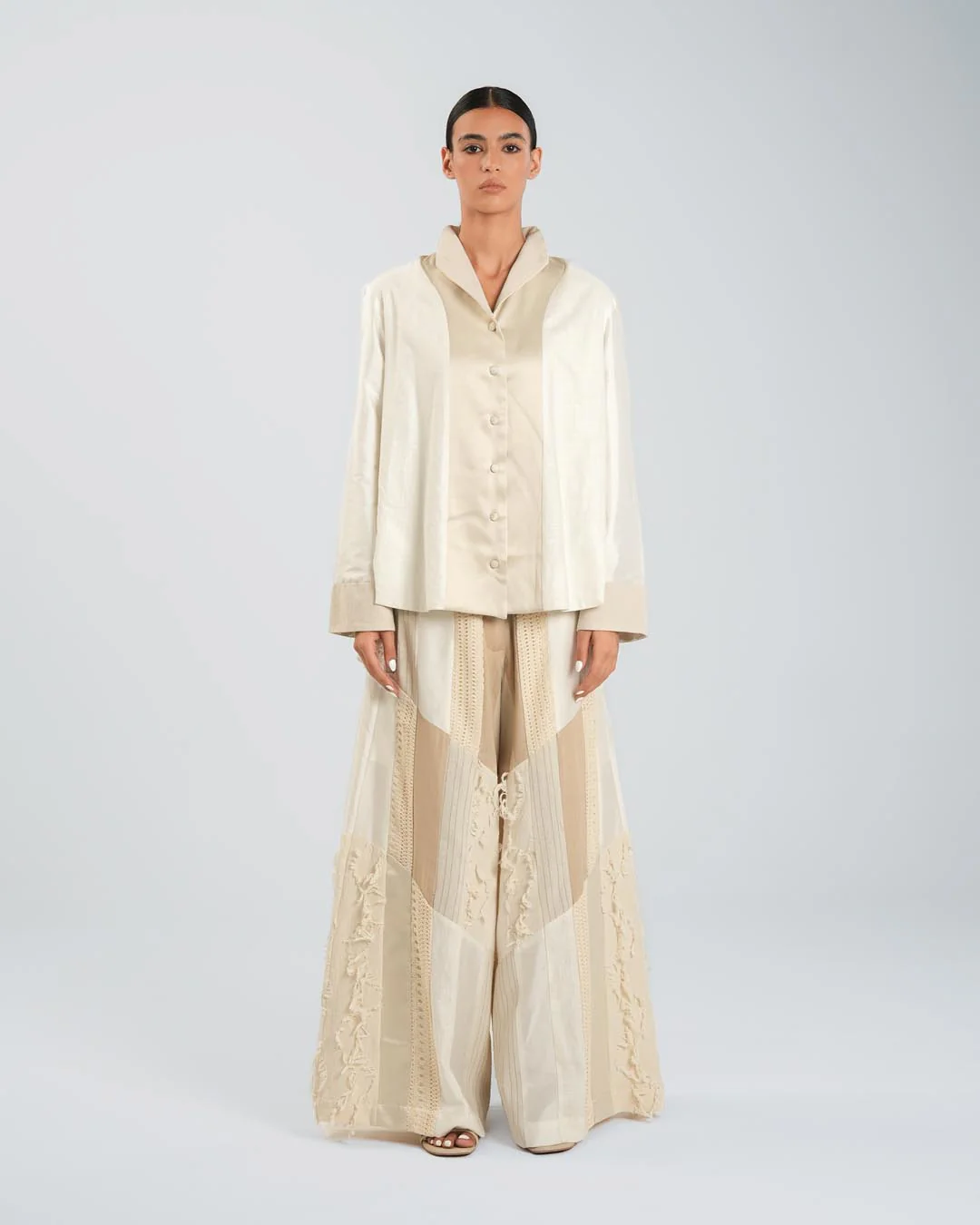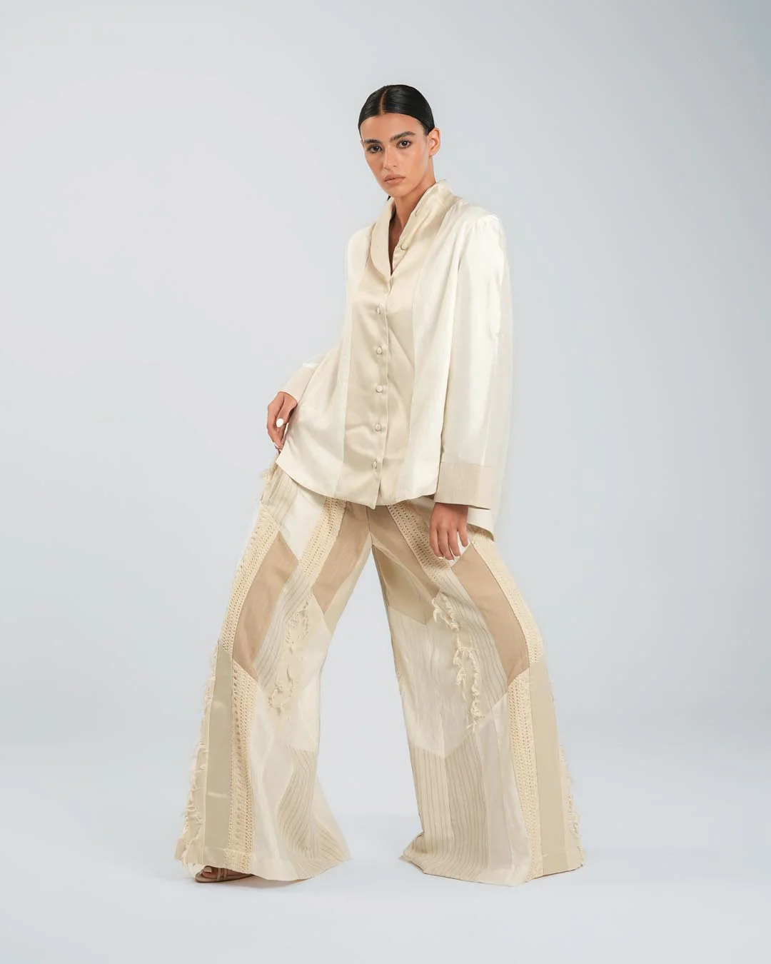 A refined, high-fashion piece that blends neutral tones with architectural flair.