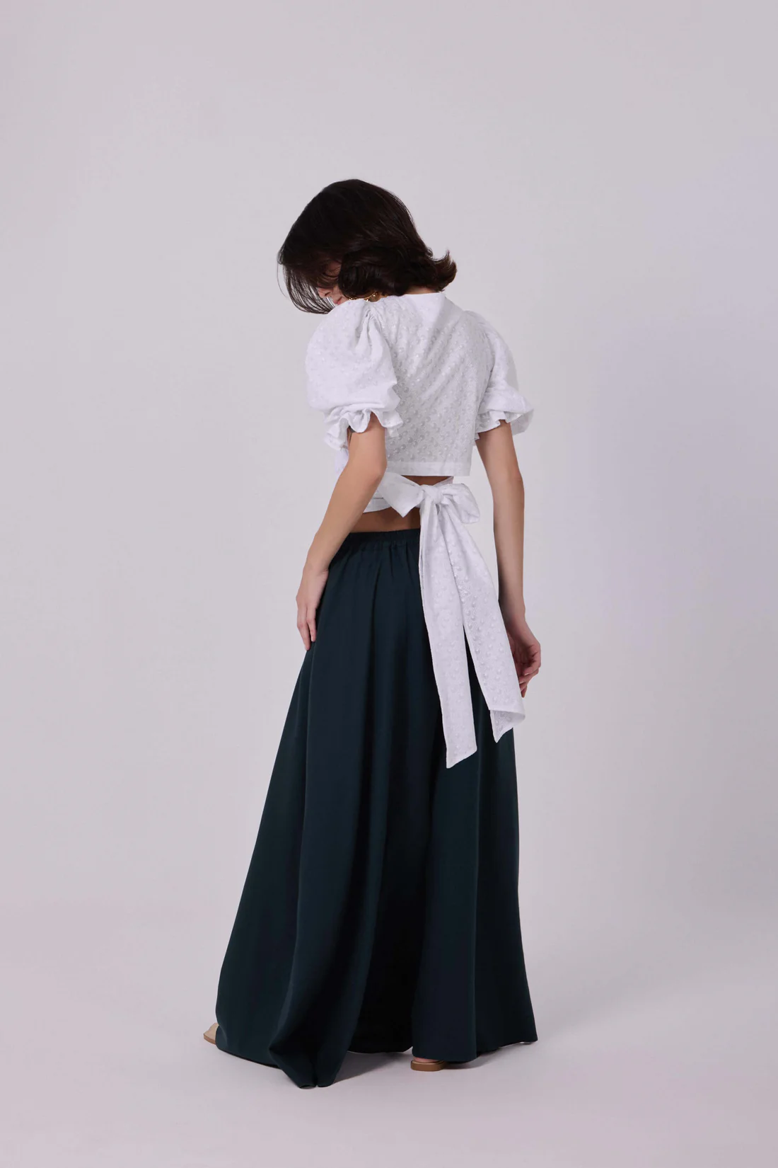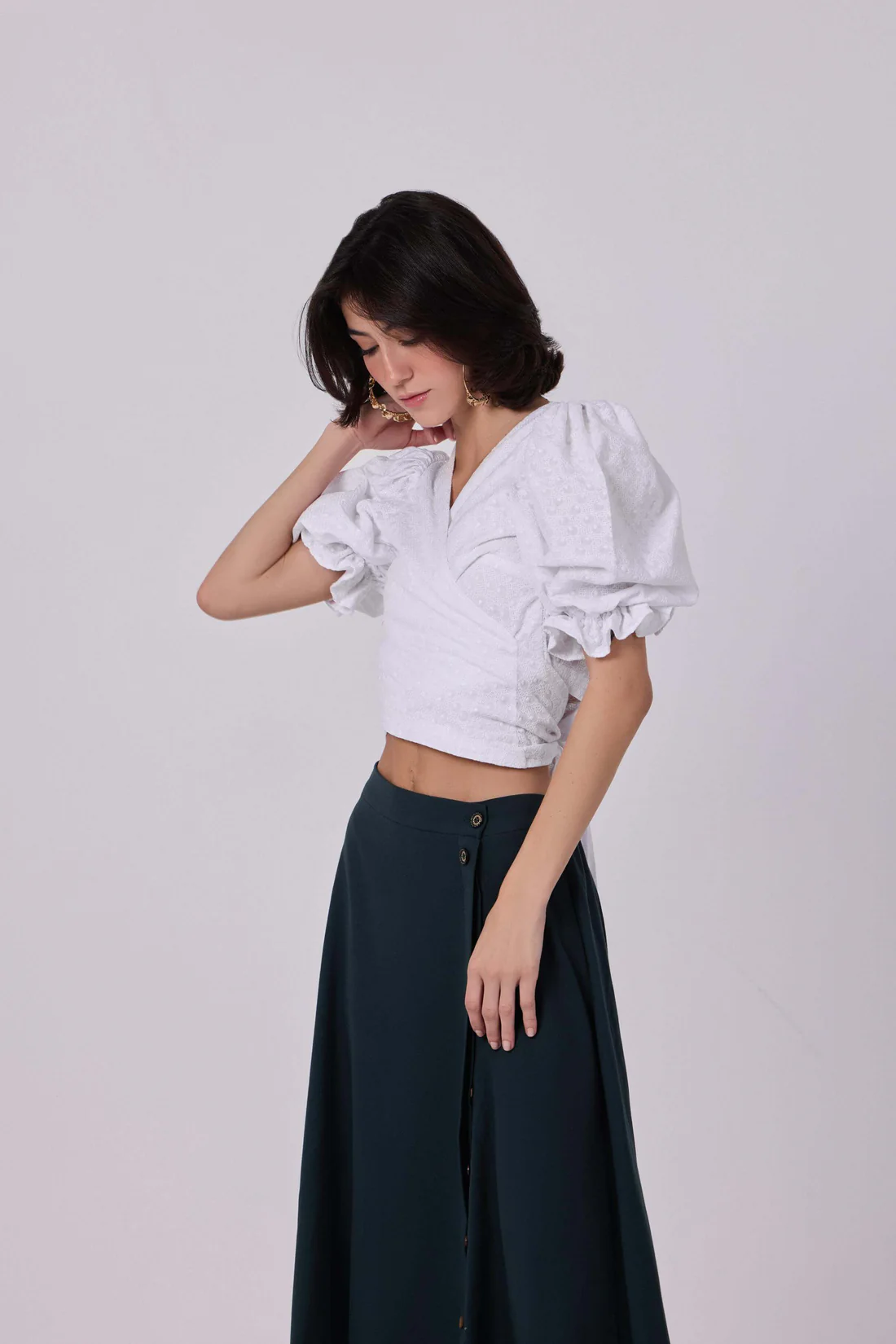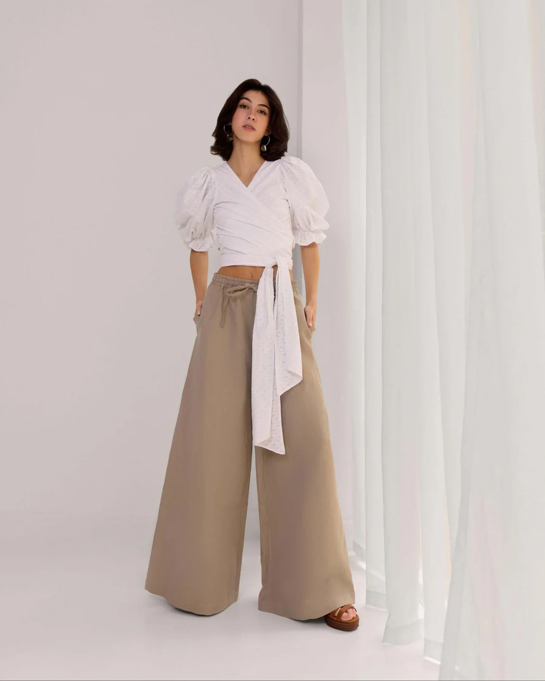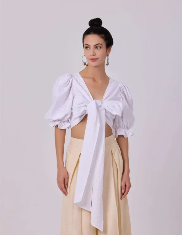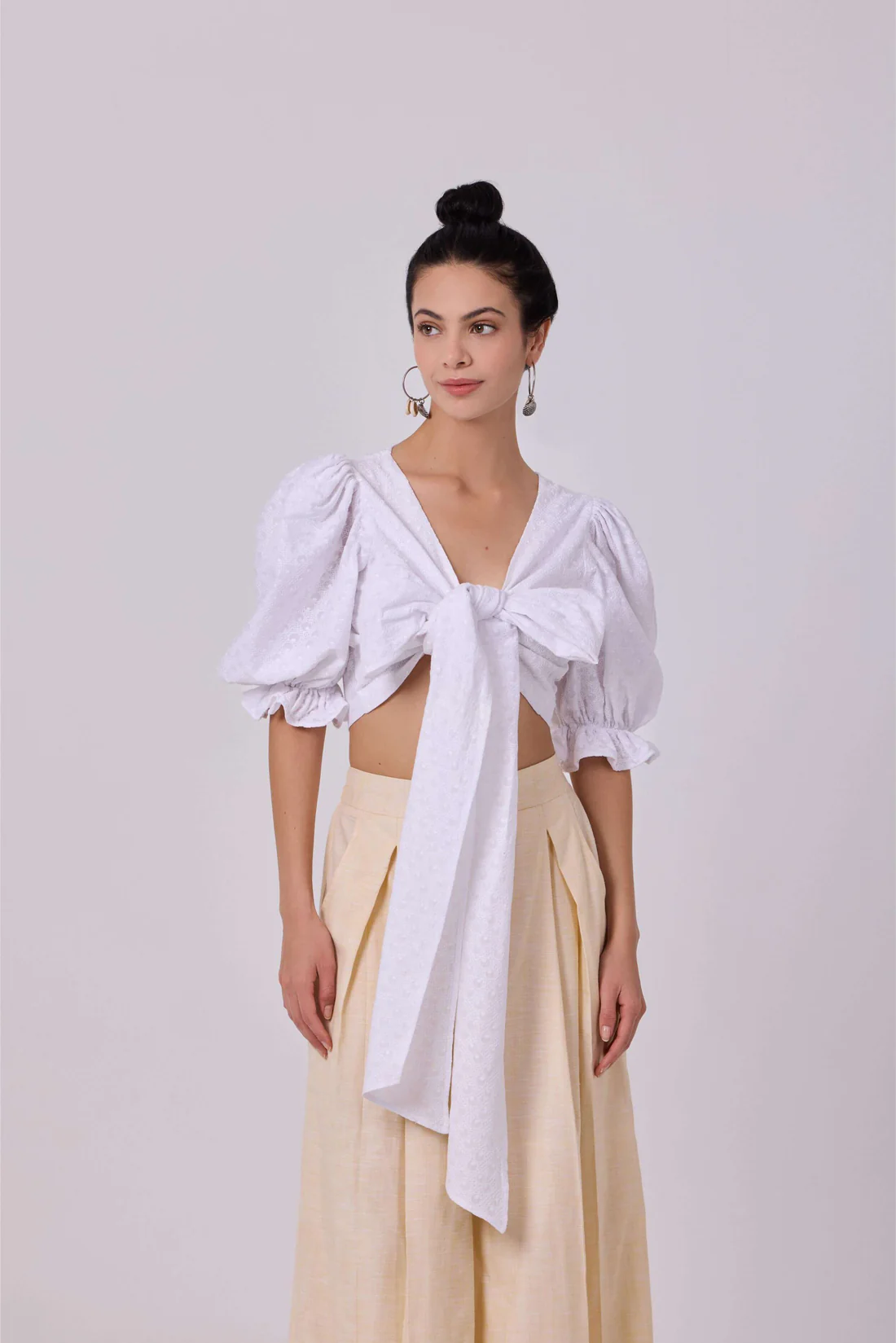 The Amara Wrap Top is a romantic staple with a touch of bold femininity. Featuring voluminous puffed shoulders and a delicately textured fabric, the top is designed with long wrap straps that can be styled in multiple ways—tied at the front, side, or back, or twisted into a cross over Knot.