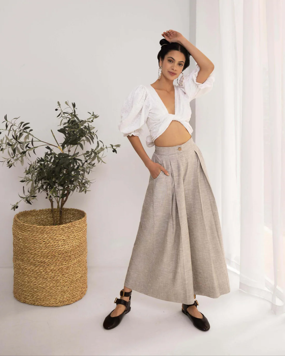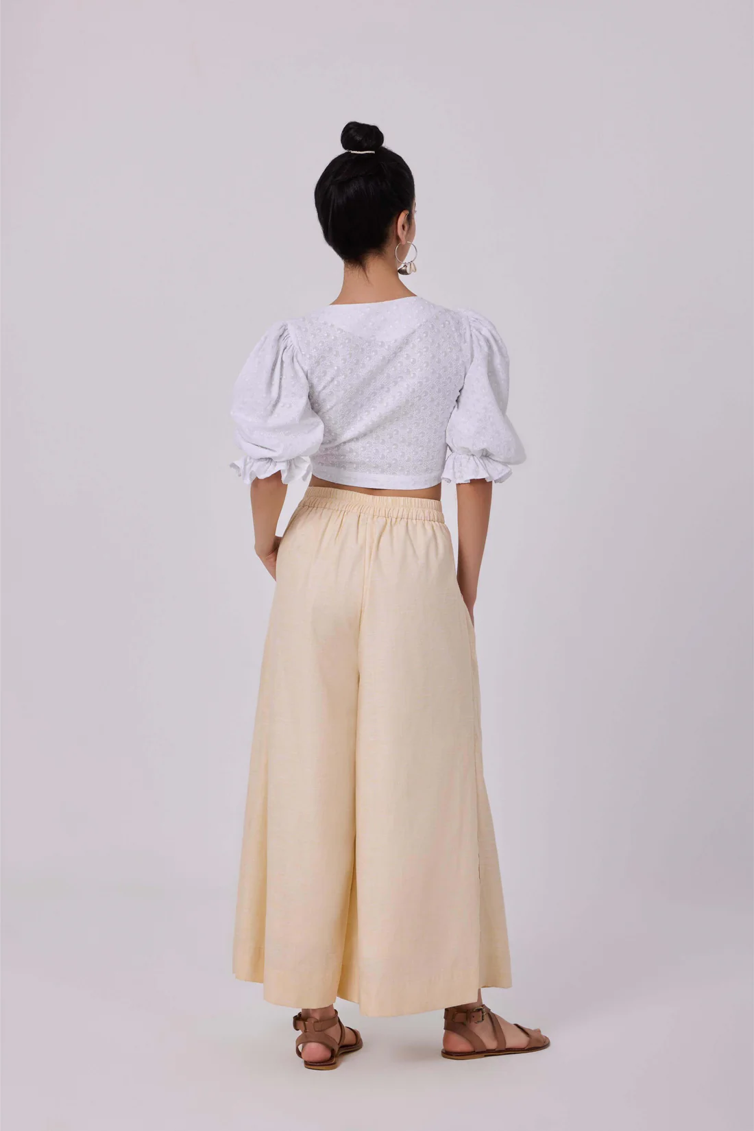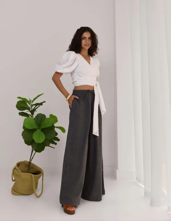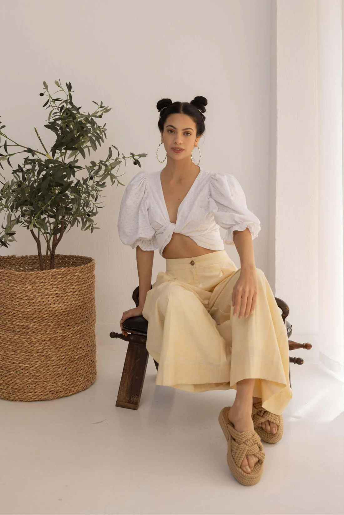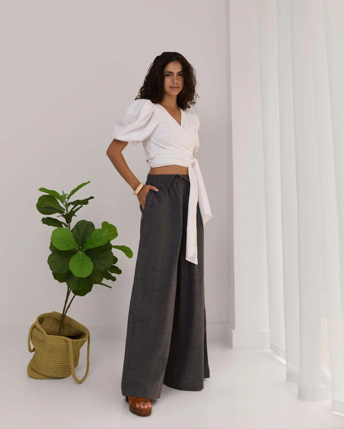 The Amara Wrap Top is a romantic staple with a touch of bold femininity. Featuring voluminous puffed shoulders and a delicately textured fabric, the top is designed with long wrap straps that can be styled in multiple ways—tied at the front, side, or back, or twisted into a cross over Knot.