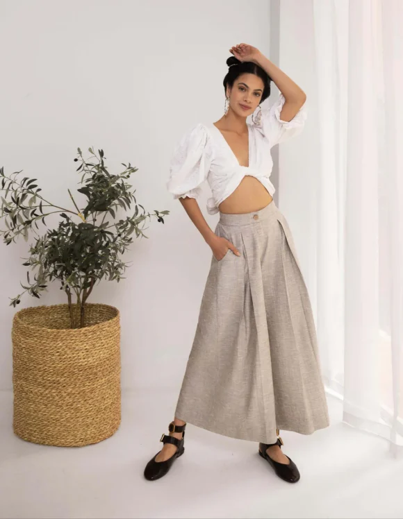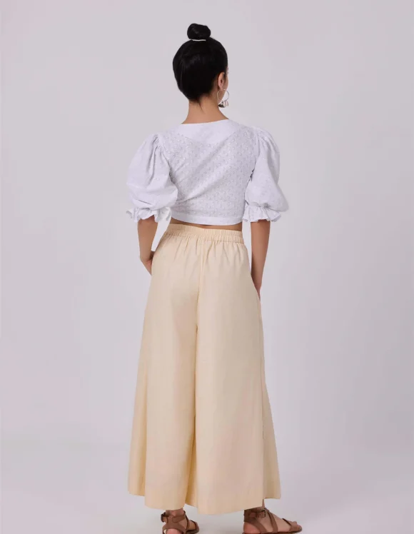 The flattering V-neckline enhances the décolleté, while the cropped silhouette pairs beautifully with high-waisted bottoms.