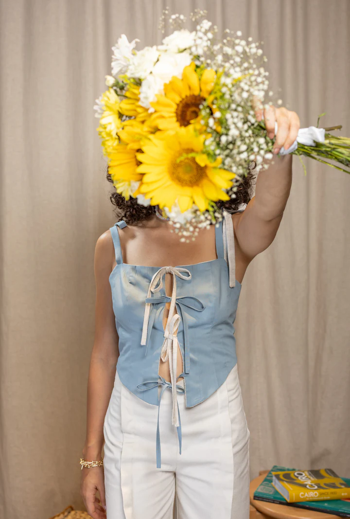 The Iteru Reversible Corset Top is a double-sided and adjustable top that can be worn on its blue cotton side or its beige linen side. The Iteru Croset Top was made from our own production waste of the Iteru Shirt, Kinna Dress and Alatia Dress. By owning this top you own one of eleven distinct tops.