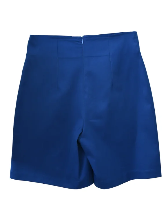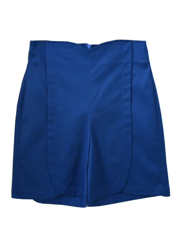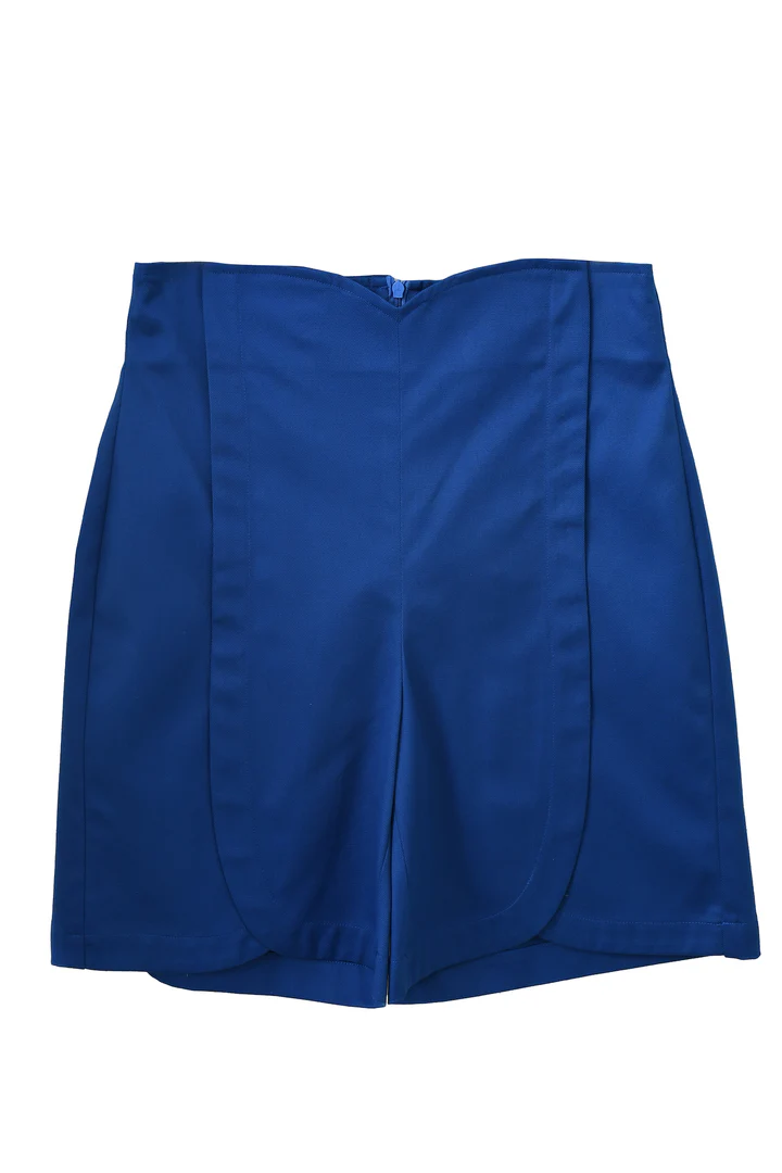 The Mesore (Greek for Leo) Shorts come in royal blue cotton, with an overlapping center front fold and a unique and flattering V-shaped waistline.