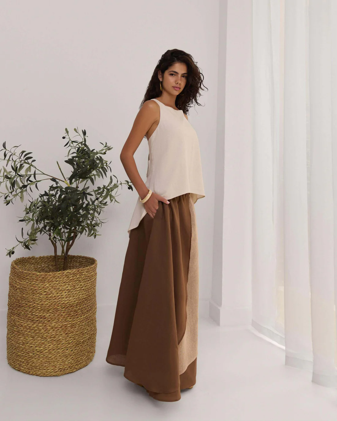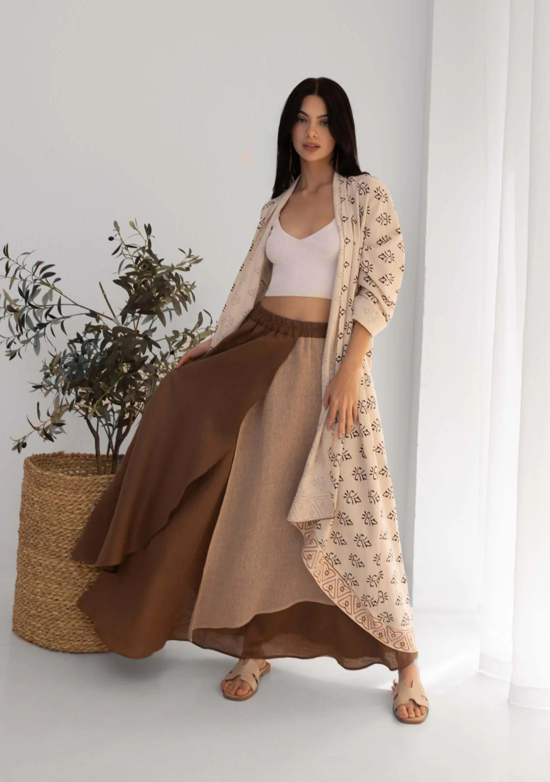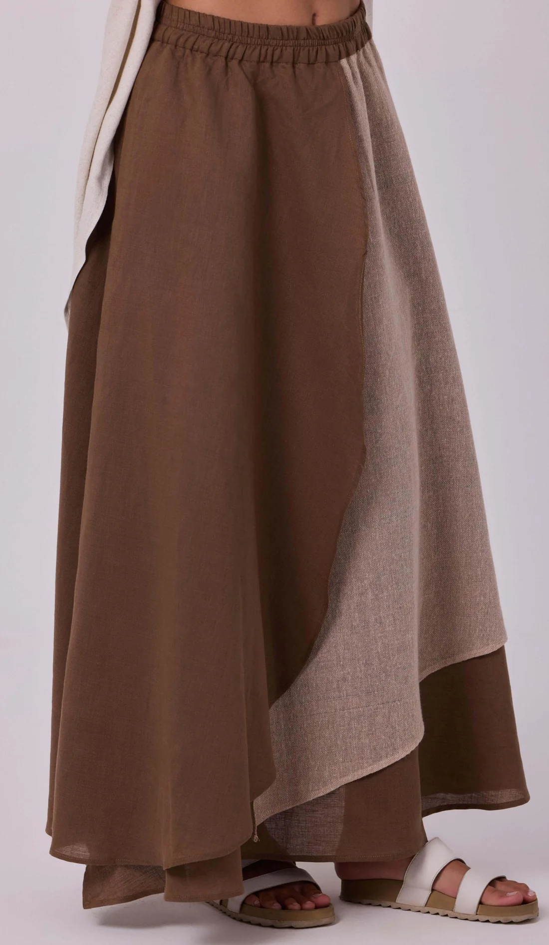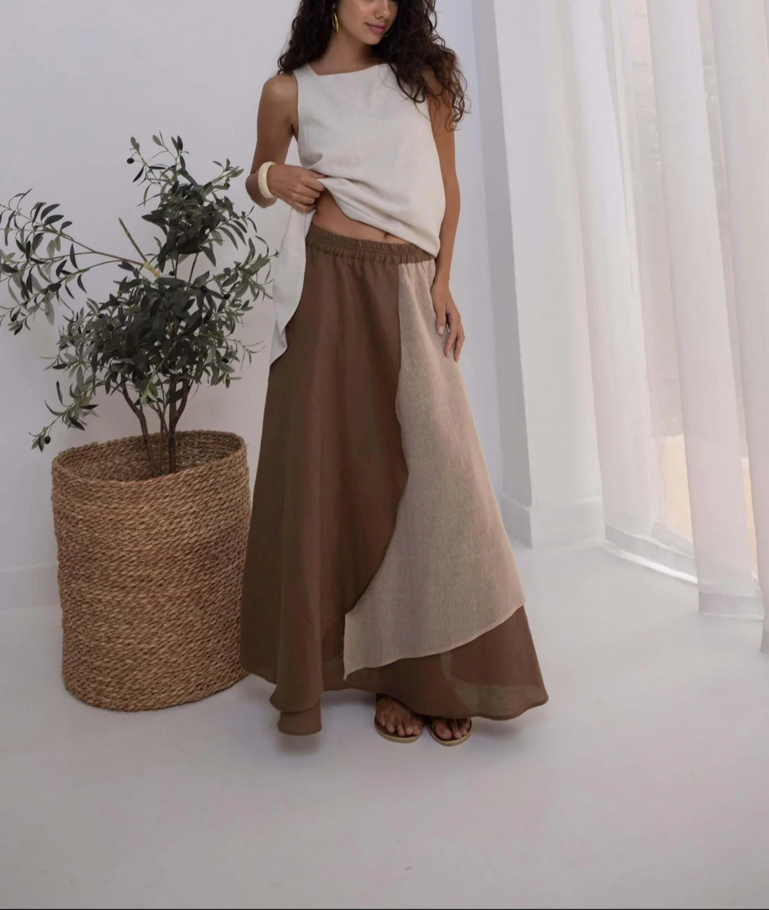 A statement of earthy elegance and free-spirited charm. This layered skirt features a beautiful contrast of textures and tones: the top layer is crafted from naturally textured raw linen in a warm beige, flowing effortlessly over a rich, cocoa-toned natural blended linen wrap. Its clever construction includes roomy side pockets, a comfortable elastic waistband, and a hidden internal ribbon for size adjustment, making it easy to cinch for a more tailored fit.