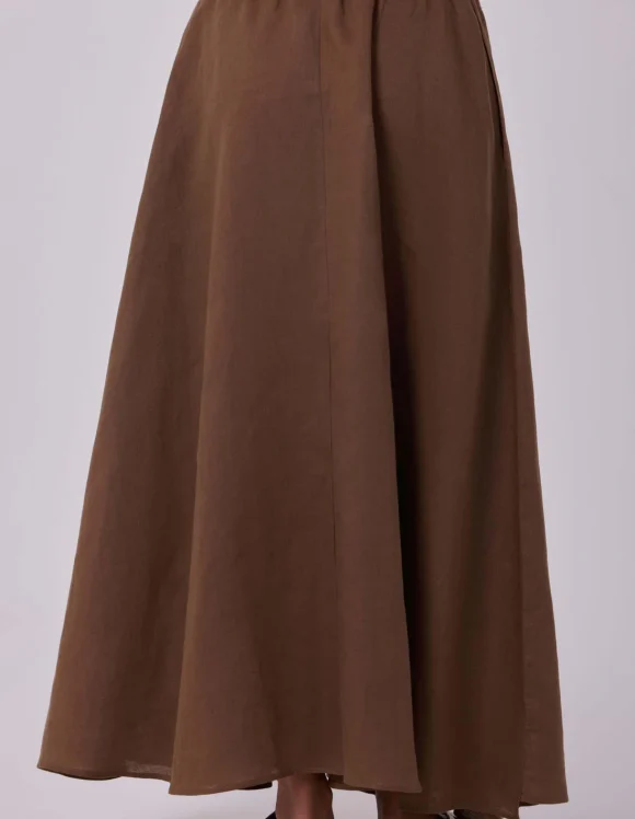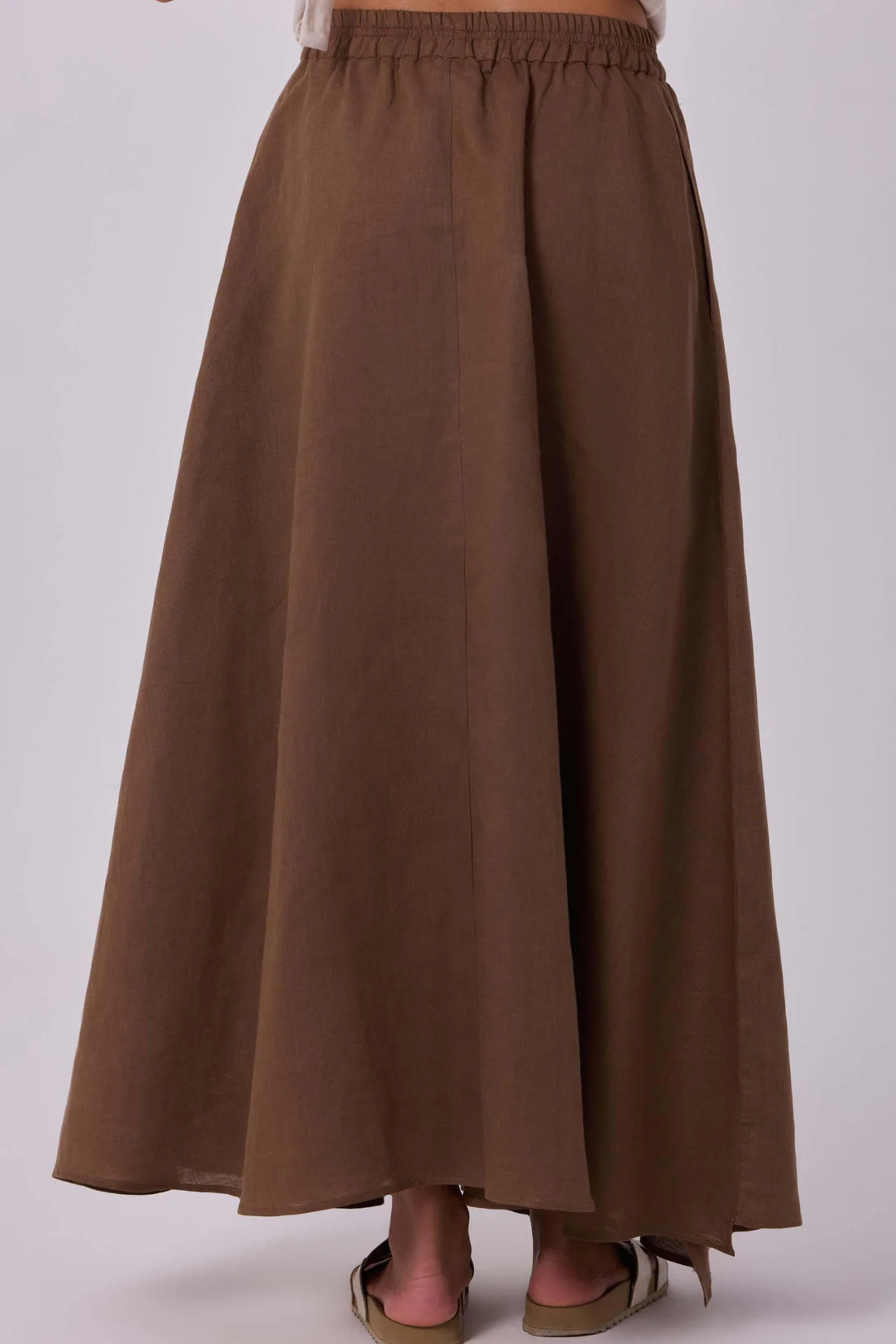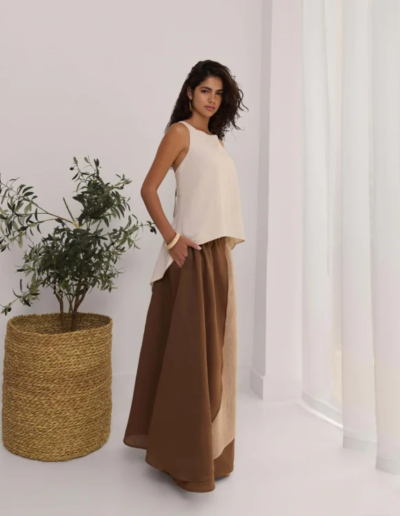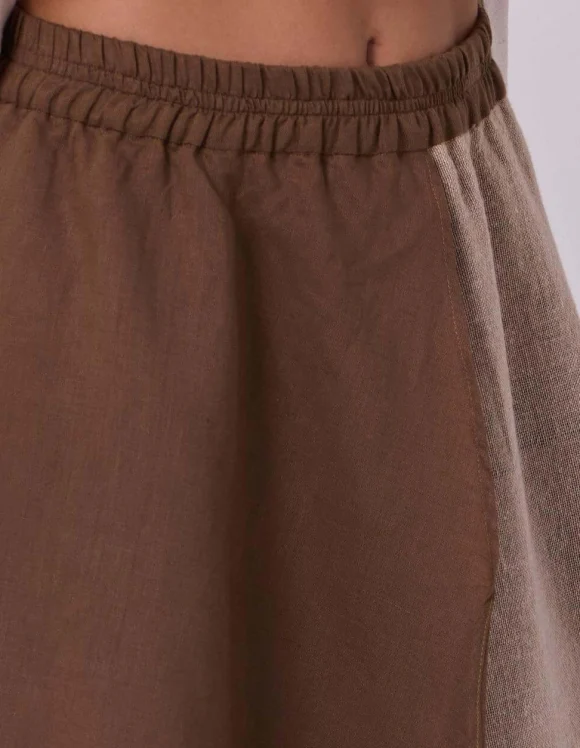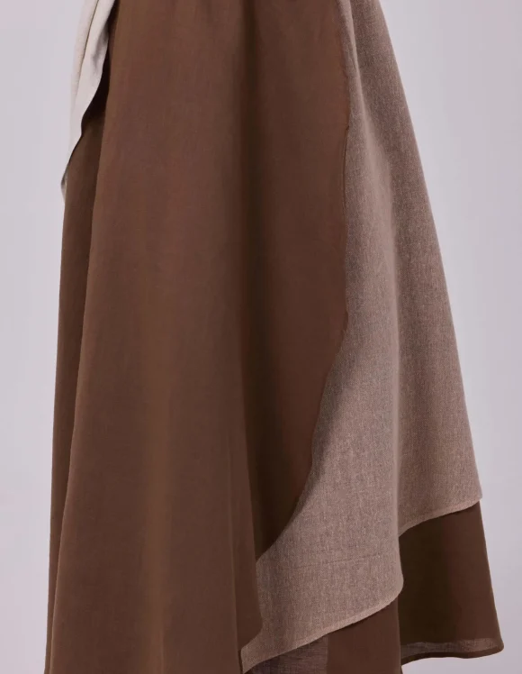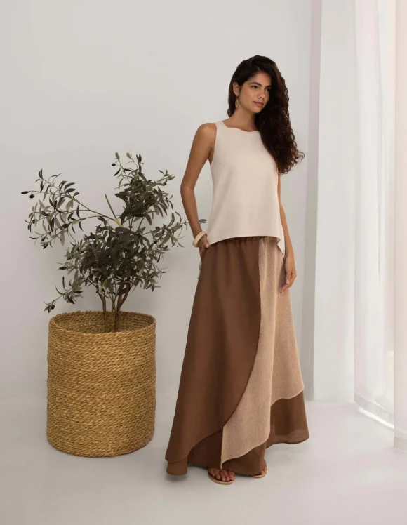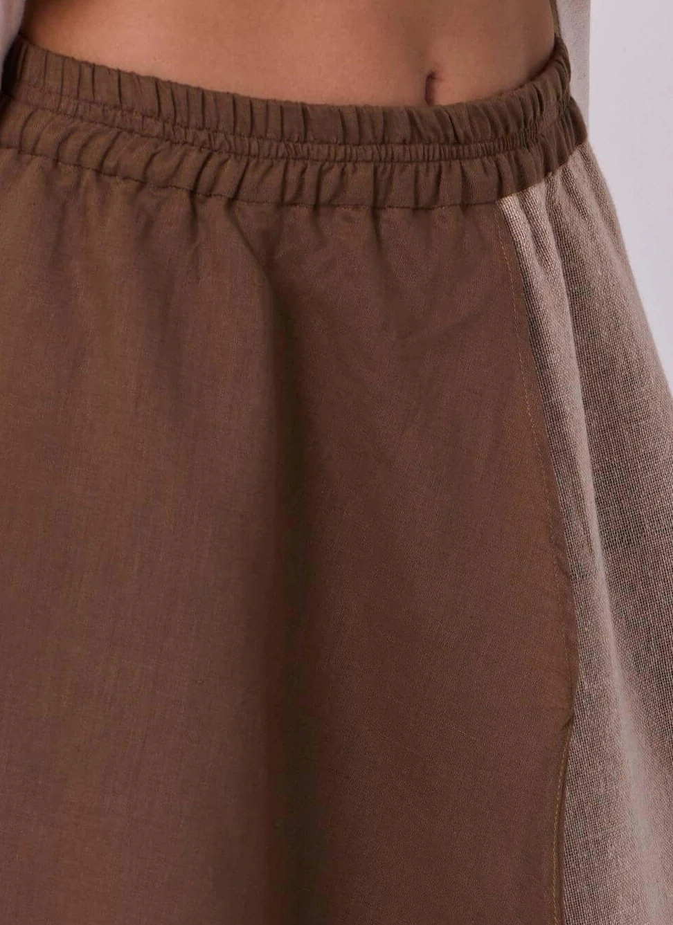 A statement of earthy elegance and free-spirited charm. This layered skirt features a beautiful contrast of textures and tones: the top layer is crafted from naturally textured raw linen in a warm beige, flowing effortlessly over a rich, cocoa-toned natural blended linen wrap. Its clever construction includes roomy side pockets, a comfortable elastic waistband, and a hidden internal ribbon for size adjustment, making it easy to cinch for a more tailored fit.