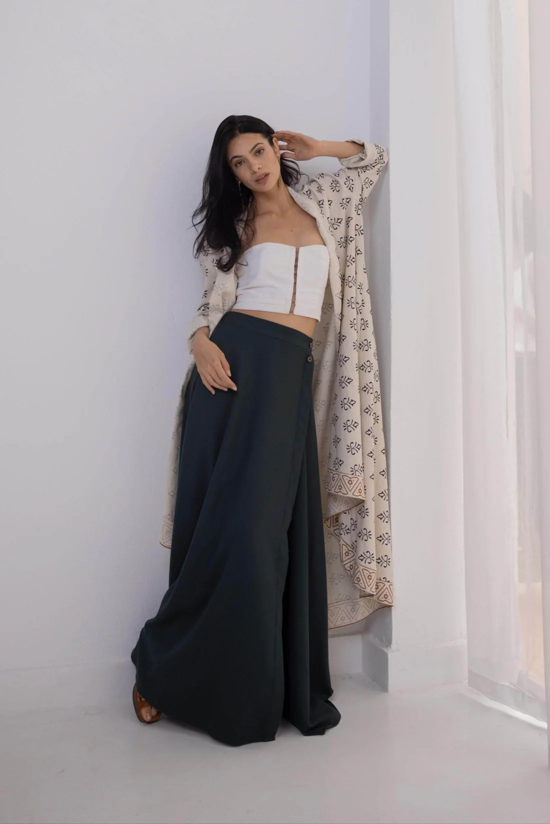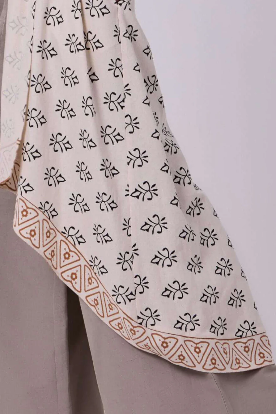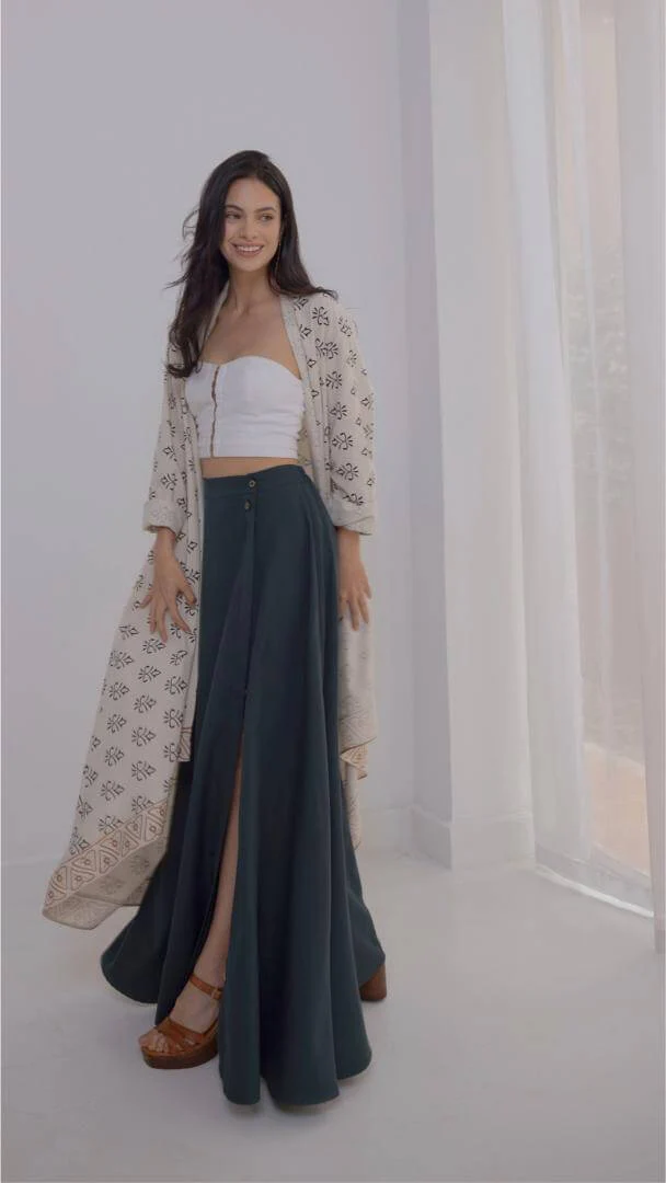 A statement in both structure and softness, the Selma Kimono is crafted from a breathable linen-cotton blend, designed to embrace comfort without compromising elegance. Its artisanal black motif print is inspired by traditional block patterns, framed with a contrasting earthy border for a refined touch.
