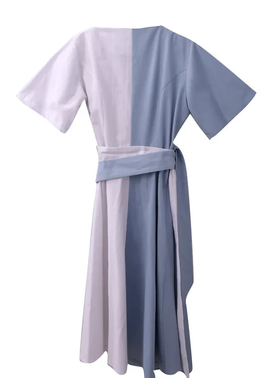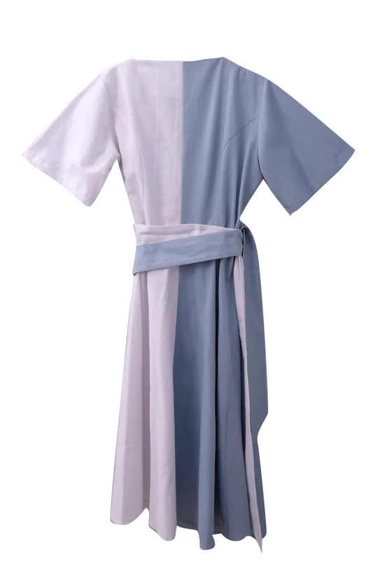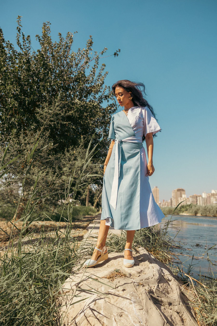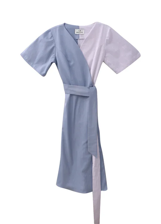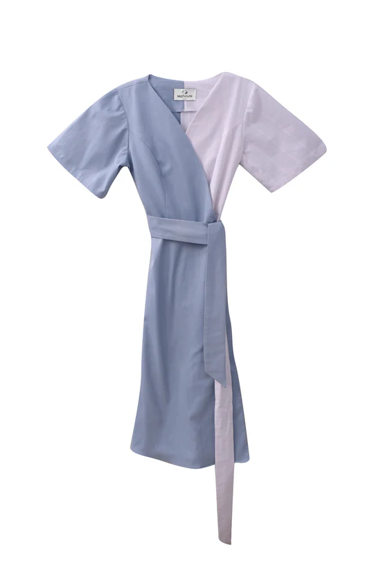 - Description: Colour-blocked wrap dress in cotton with a light blue and white half