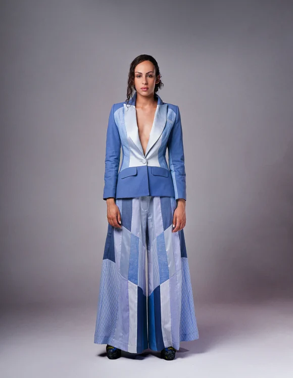 A statement in craftsmanship, this tailored patchwork jacket is crafted from a mix of linen and satin in varying blue tones. Designed with a flattering hourglass silhouette, it features structured tailoring, front pockets, and a sharp, polished finish. Fully lined in silk for luxurious comfort.