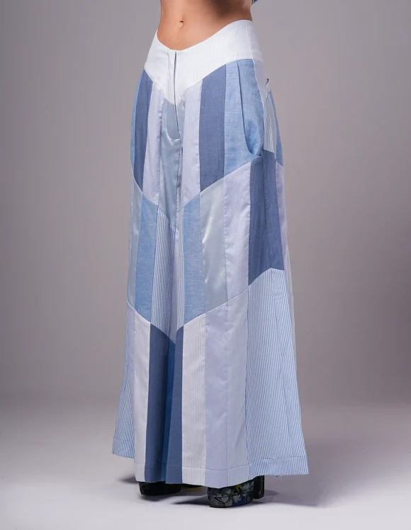 Crafted from a mix of striped and checkered poplin with linen, these tailored patchwork pants offer a unique blend of texture and pattern. The flattering V-shaped waistline adds a modern edge, while four functional pockets bring practicality to the bold design.