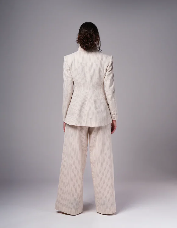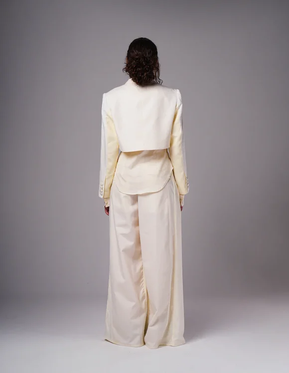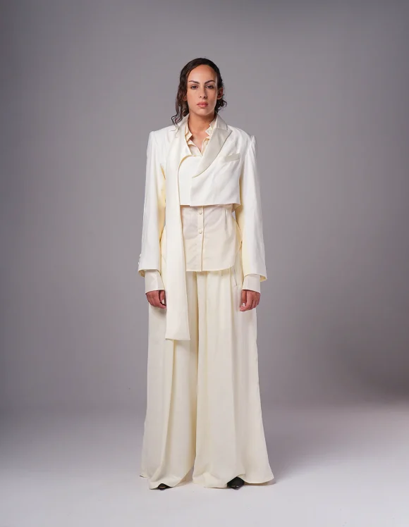In a refined off-white tone, these tuxedo-inspired pleated pants are tailored from a luxurious blend of satin, linen, and cotton blend. The sharp pleats and flattering V-shaped waistline bring a modern edge to classic tailoring, while four functional pockets ensure practicality without compromising style. Fully lined in silk for a