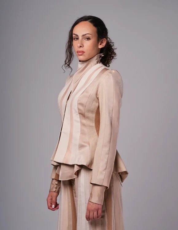 The Panelled Nude Blazer is a structured statement piece, crafted from a rich mix of taffeta, cotton, linen, crepe, and washed silk. Designed in an elegant hourglass silhouette, it is fully lined with silk for a luxurious finish.