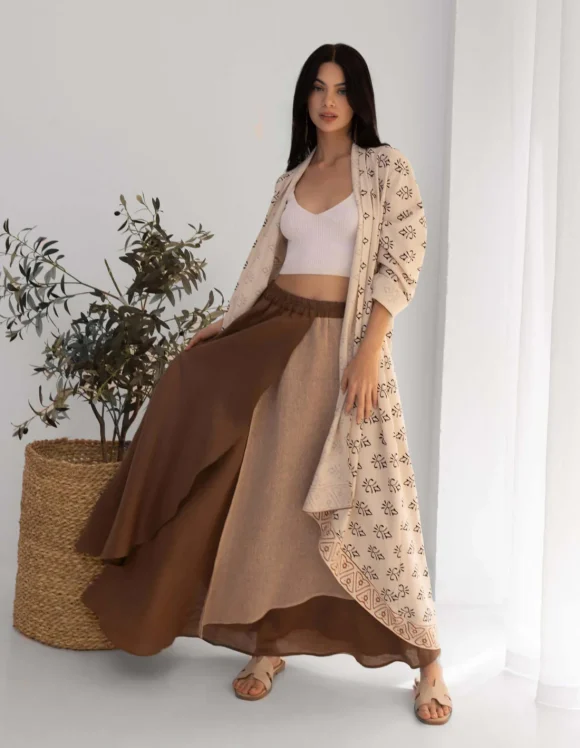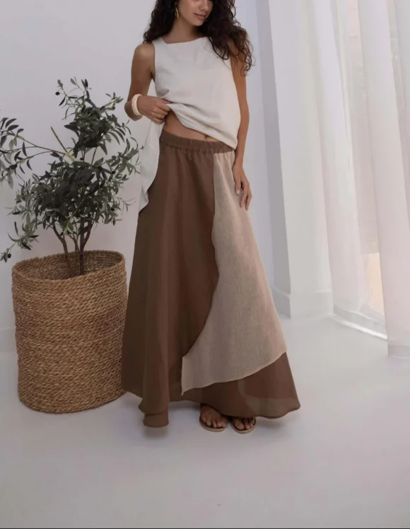 A statement of earthy elegance and free-spirited charm. This layered skirt features a beautiful contrast of textures and tones: the top layer is crafted from naturally textured raw linen in a warm beige, flowing effortlessly over a rich, cocoa-toned natural blended linen wrap. Its clever construction includes roomy side pockets,