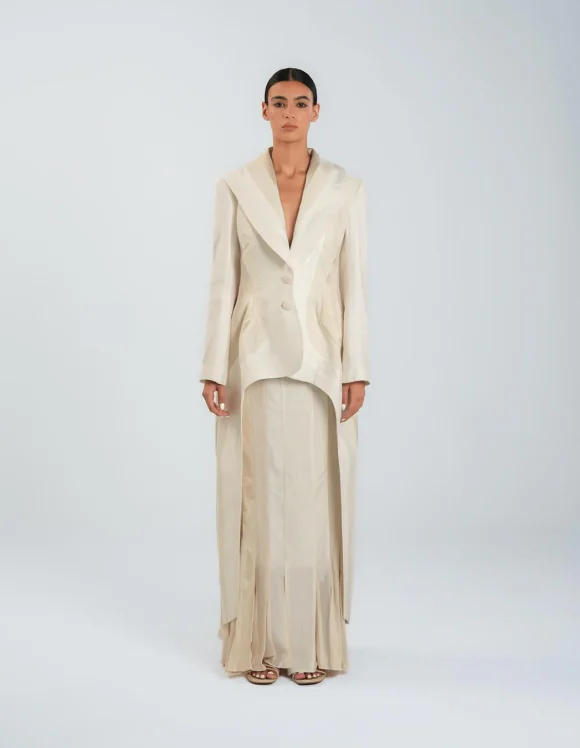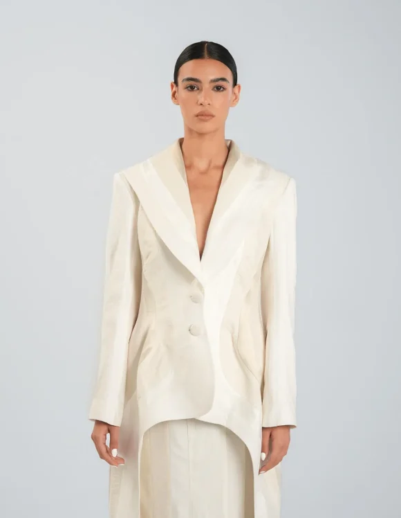 This untraditional Panelled Beige Blazer is sculpted from six different fabrics, ranging from linen to satin, creating rich texture and dimension. Featuring long sides, a cut-out back, and strategically placed panels that highlight the feminine silhouette, it redefines classic tailoring with an avant-garde twist.